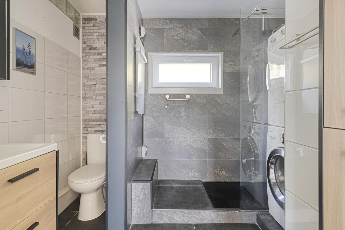 De badkamer is modern en slim ingedeeld. Voorzien van een toilet, wastafel en een ruime douche, en met plek voor zowel de wasmachine als droger, een praktische, frisse ruimte waarin je zo aan de slag kunt. De tweede verdieping herbergt nog een vierde slaapkamer, eveneens keurig afgewerkt en voorzien van een dakraam voor, jawel, nog meer licht. Op de overloop vind je extra bergruimte, ideaal om spullen netjes op te bergen.