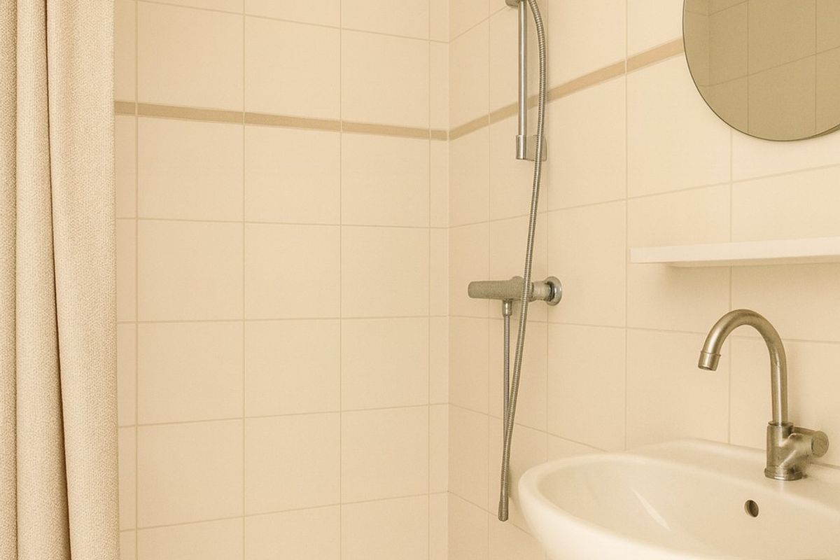 De betegelde badkamer (ca. 1.29 x 1.11) is eenvoudig uitgevoerd en voorzien van douche, vaste wastafel met planchet en spiegel.