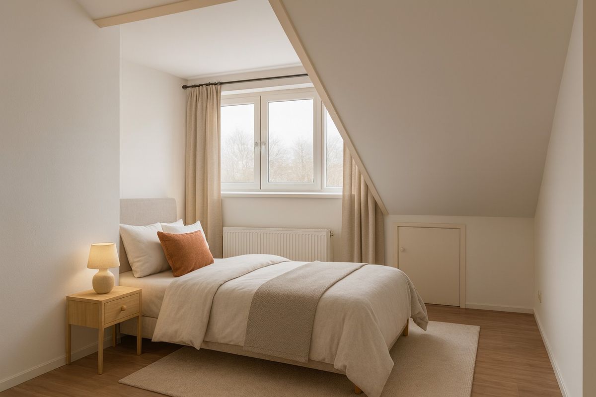 De ruime voorslaapkamer (ca. 4.45 x 3.98/2.78) heeft een vaste kast en een dakkapel, waardoor de ruimte extra licht en breedte krijgt.