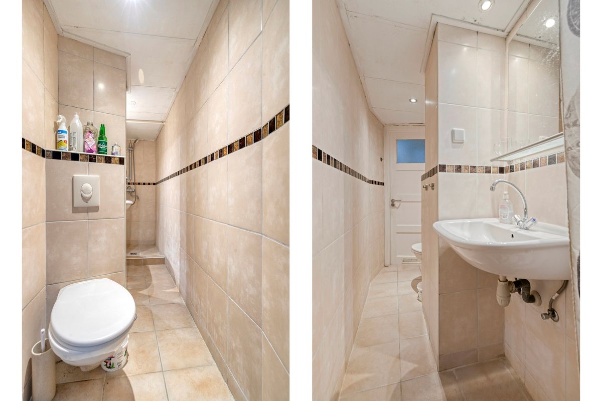 De badkamer is compact maar functioneel, voorzien van een douche, wastafel en toilet.