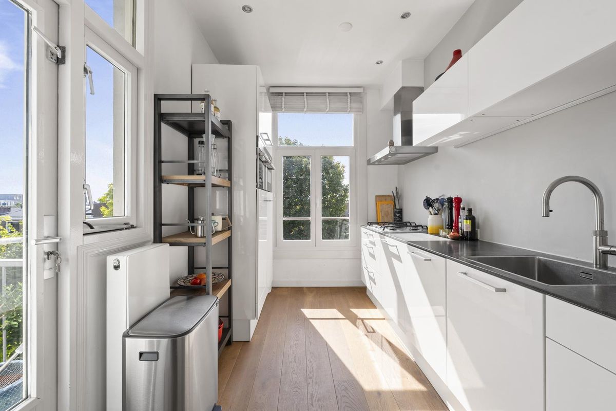 3e verdieping: overloop met apart toilet. Luxe halfopen keuken, volledig uitgerust met oven, stoomoven, vaatwasser, magnetron, Quooker, vriezer en koelkast. zeer ruime woonkamer met balkons aan zowel de voor- als achterzijde.