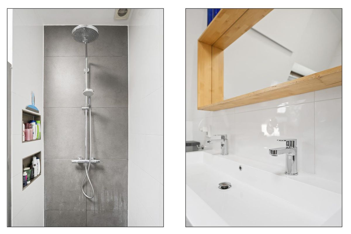 4th floor: two generous bedrooms and a third room (currently used as a laundry room) with access to a sunny roof terrace. Spacious bathroom with walk-in shower, toilet, and double sink.