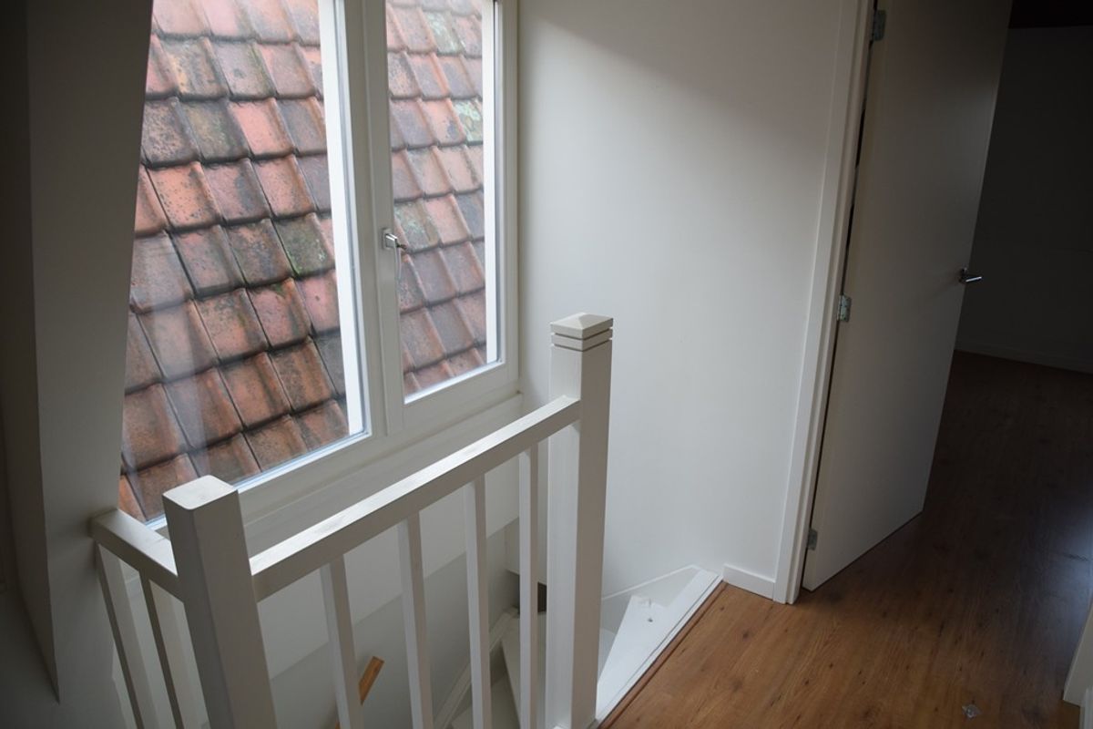 Trapopgang, overloop en de kamer aan de achterzijde van de woning. De kamer is ca. 3.5 m x 5 m.