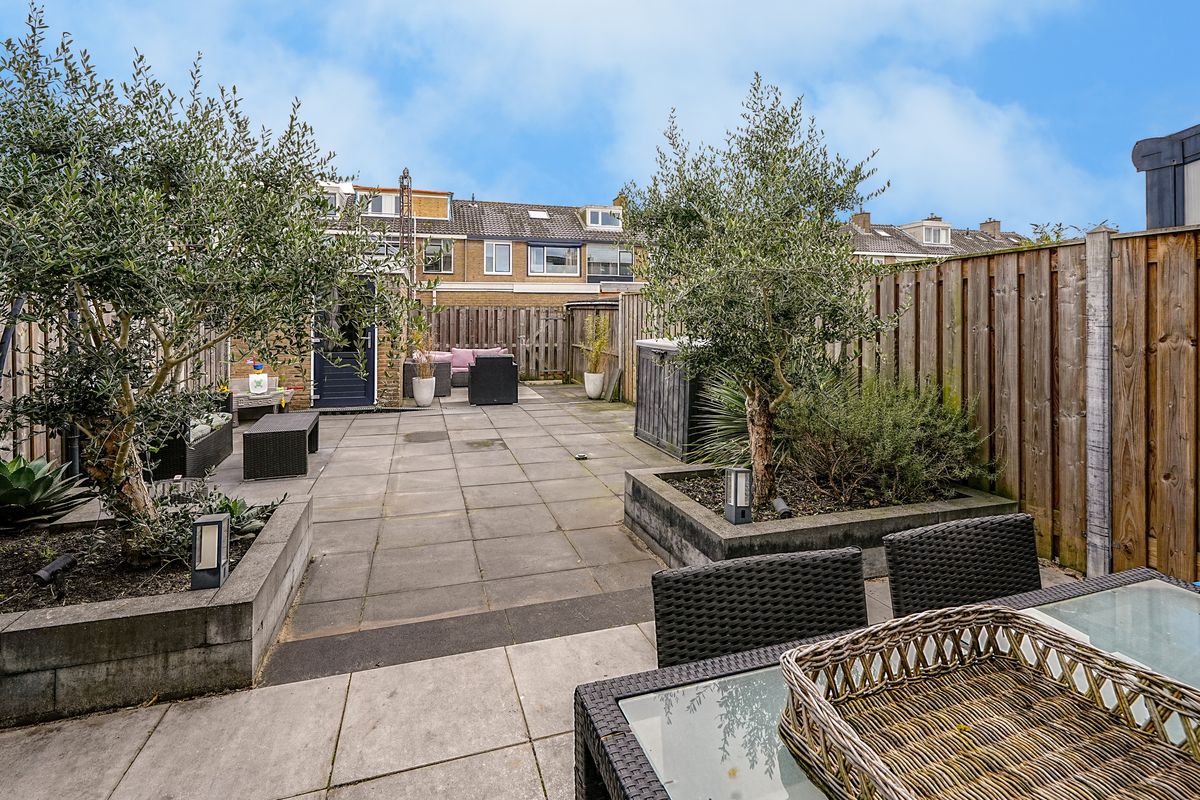 De tuin is omheind met een nette houten schutting, wat veel privacy biedt. Groene accenten worden toegevoegd door diverse plantenbakken met onder andere olijfbomen en siergrassen, die een mediterrane sfeer creëren. Achter in de tuin bevindt zich een stenen berging, ideaal voor het opbergen van fietsen en tuingereedschap, met daarnaast een handige achterom.