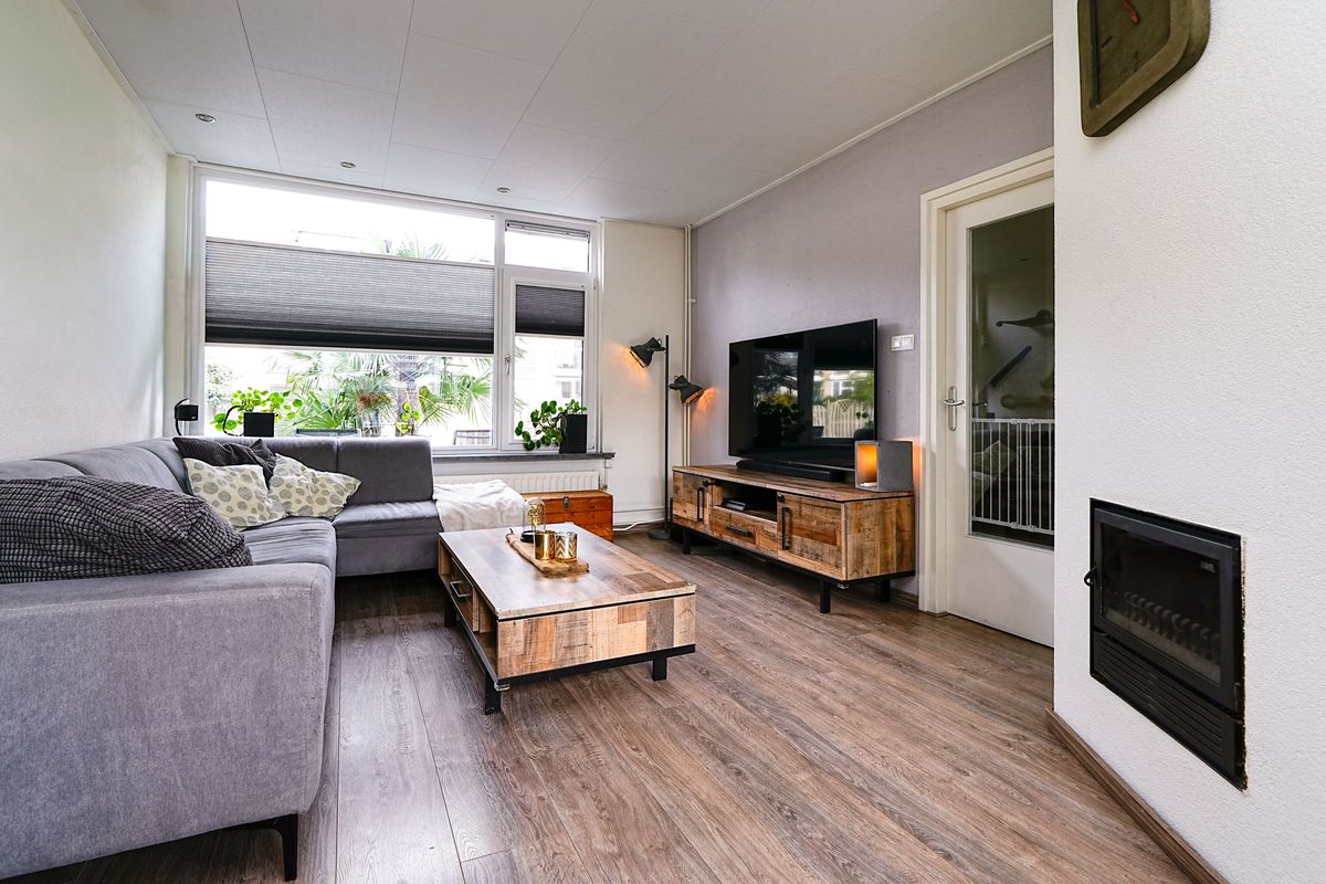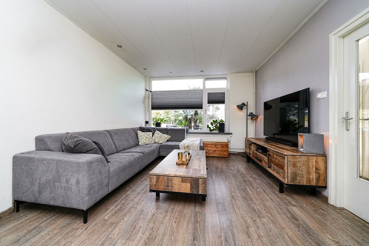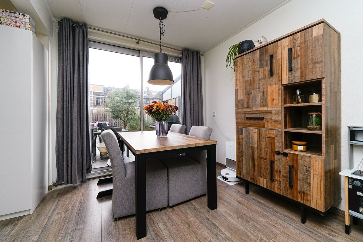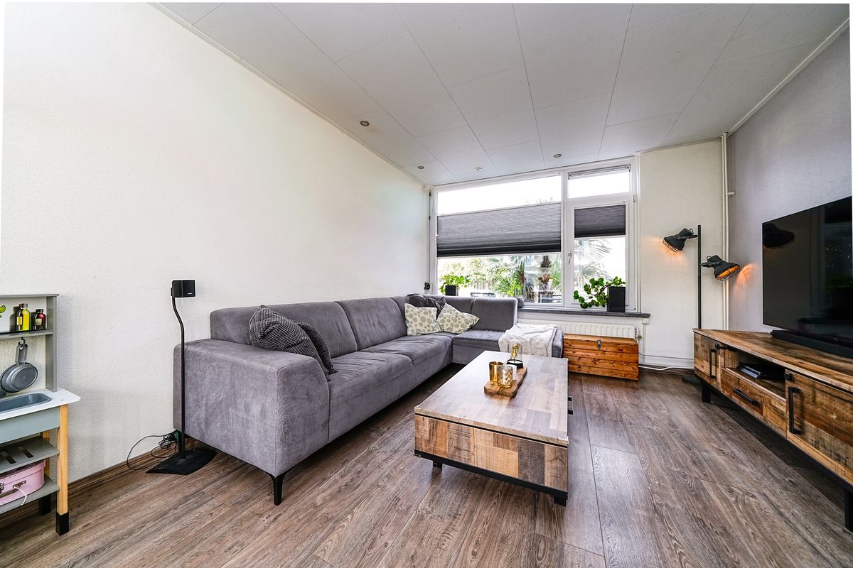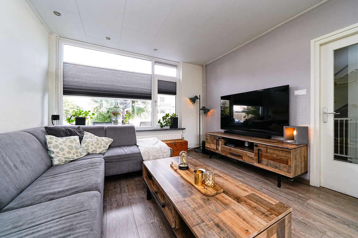 Zodra je binnenstapt, voel je de prettige sfeer. De lichte woonkamer biedt royaal de ruimte voor een sfeervolle zithoek én een eettafel waar vrienden graag aanschuiven voor een borrel of etentje. Dankzij de grote ramen valt het daglicht rijkelijk binnen. Er is genoeg plek om je favoriete woonaccessoires én dierbare herinneringen een mooie plek te geven. Vanuit de woonkamer heb je direct zicht op de groene, riante achtertuin.