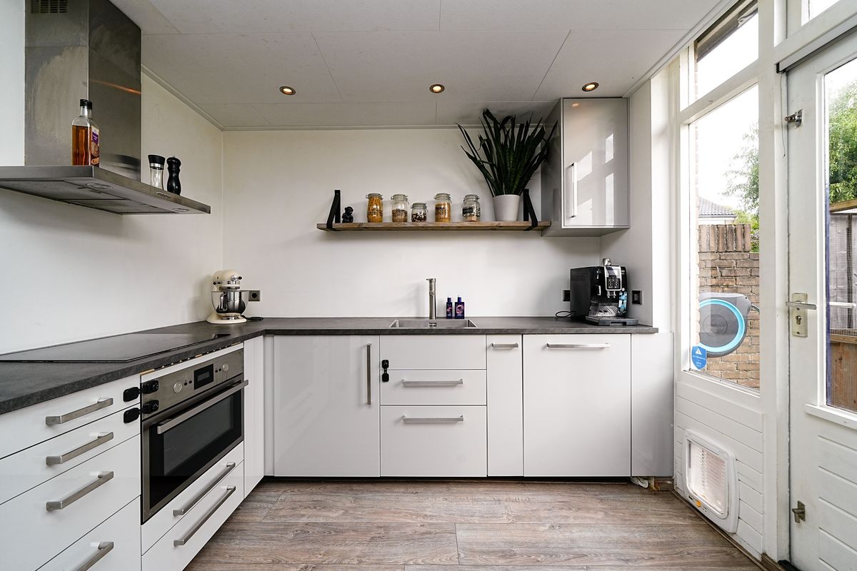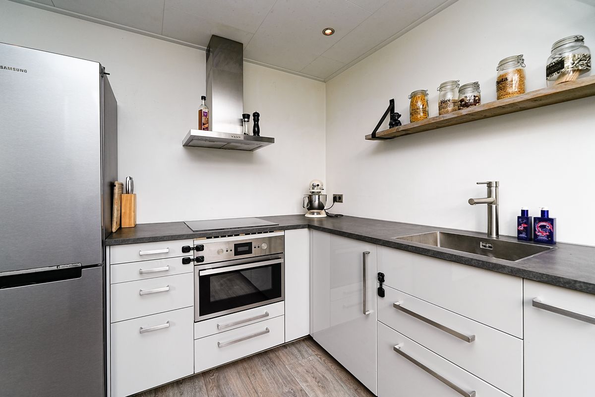 Aan de achterzijde van de woning bevindt zich de moderne keuken. Deze heeft een praktische hoek-indeling met voldoende werk- en bergruimte, een kookgedeelte met kookplaat en afzuigkap, vaatwasser en combi-oven en een vrijstaande koelkast.
