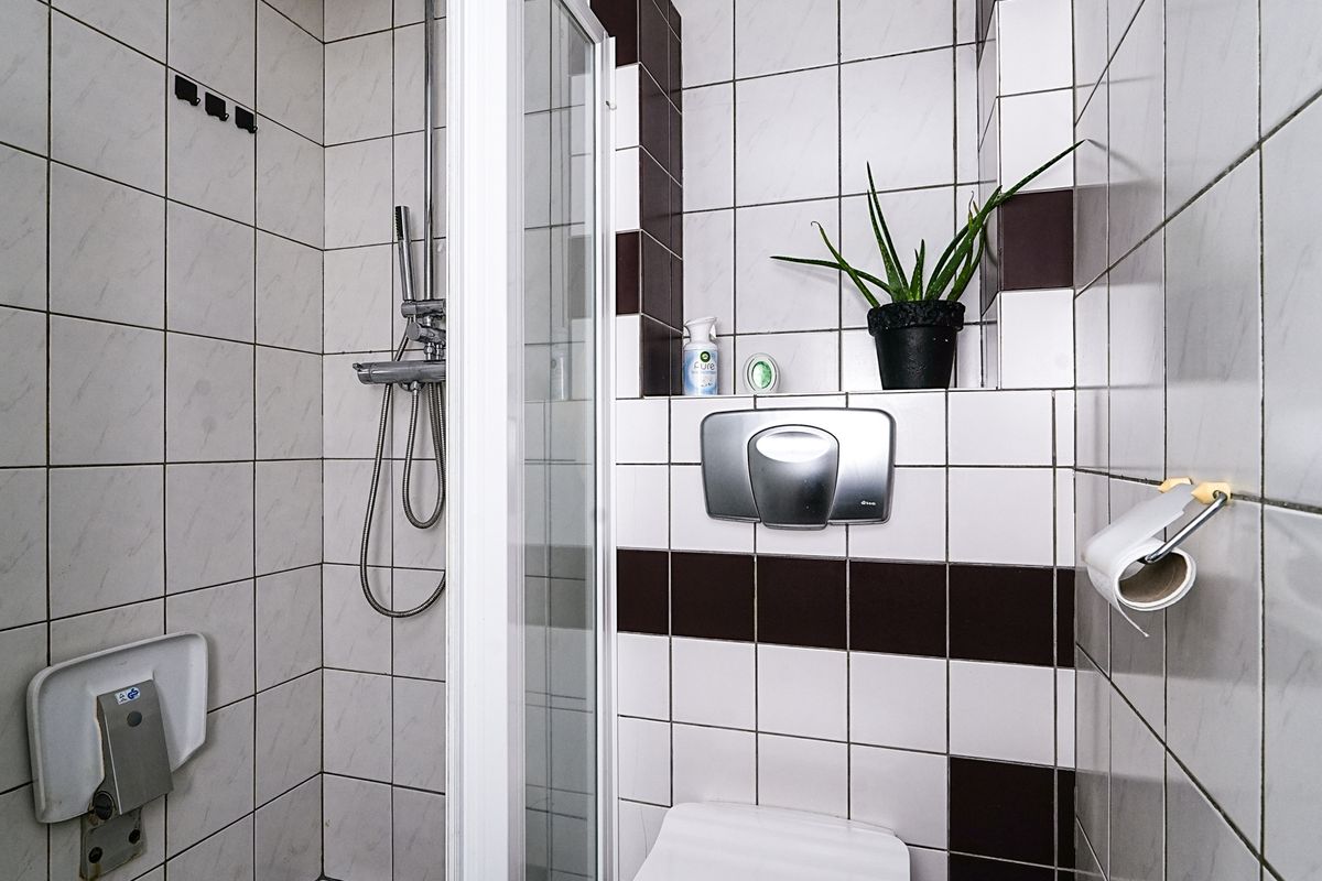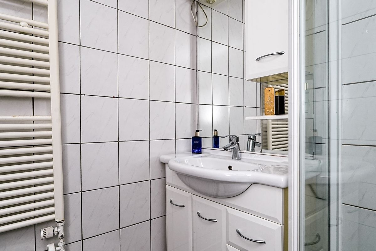 De badkamer ligt aan de voorzijde en is compact maar efficiënt ingedeeld. Deze is voorzien van een douche, wastafel en toilet. Dankzij het raam is er natuurlijke ventilatie en daglicht aanwezig.