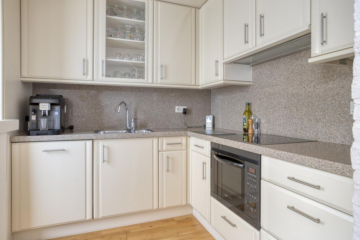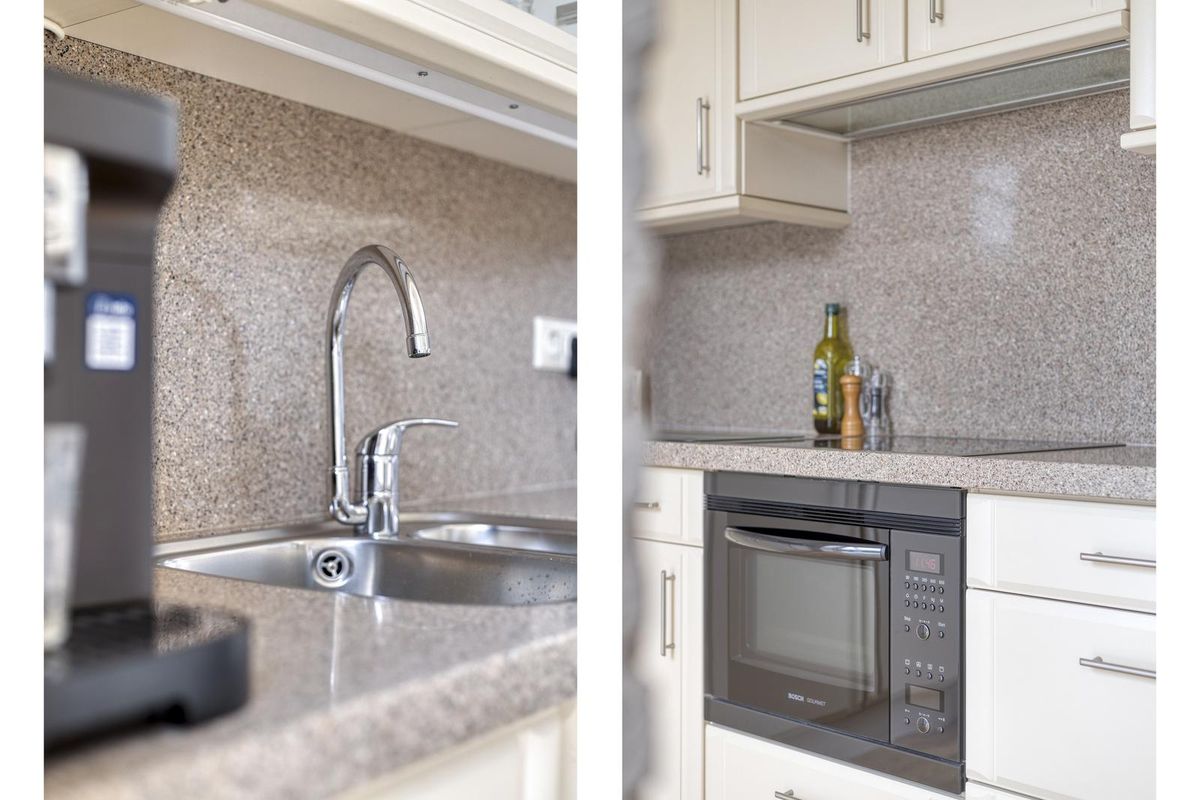 De keuken in hoekopstelling is uitgerust met alles wat je nodig hebt: een inductiekookplaat, vaatwasser, koelkast, vriezer, combi-oven/magnetron en een boiler voor snel warm water. Hier kook je met plezier!