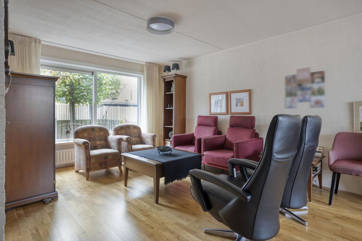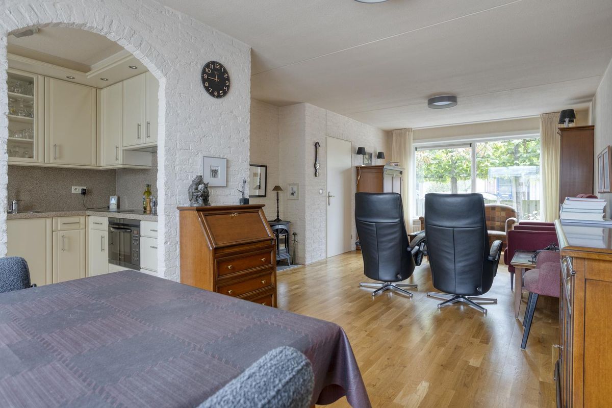 Via de hal heb je toegang tot de woonkamer en het toilet. Het toilet is voorzien van een fonteintje en recent nog vernieuwd. In de woonkamer trekt de mooie parketvloer meteen de aandacht. De grote ramen zorgen voor een heerlijke lichtinval, waardoor de ruimte warm en uitnodigend aanvoelt. Onder de trap vind je een handige trapkast voor extra bergruimte.
