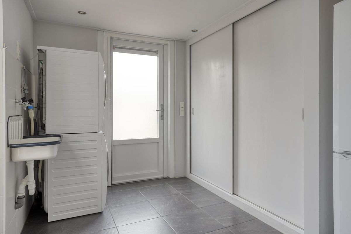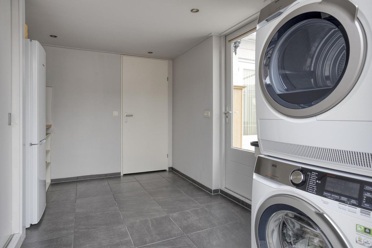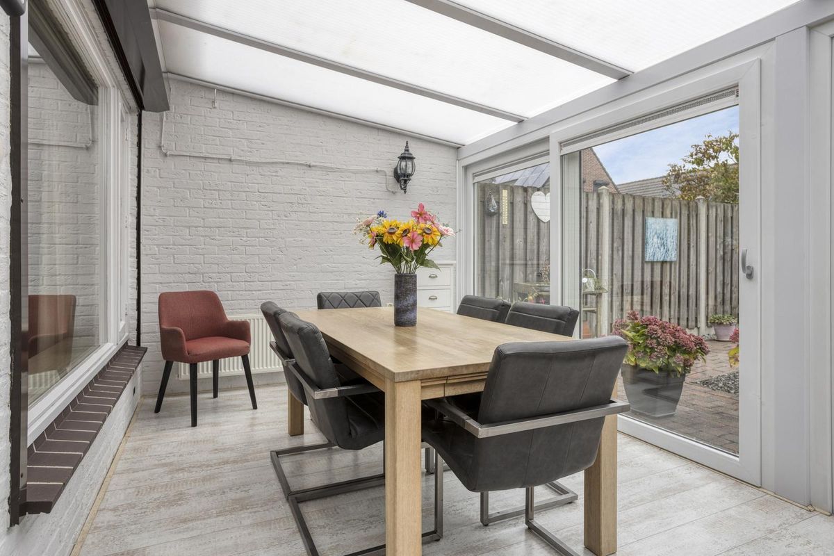 De serre is een heerlijke plek om het hele jaar door te genieten. Dankzij de verwarming, laminaatvloer en het zonnescherm is het hier zowel in de zomer als winter goed toeven. Vanuit de serre bereik je de bijkeuken, waar ruimte is voor de wasmachine en droger en waar praktische inbouwkasten extra opbergruimte bieden. Vanuit hier stap je direct de garage in, die voorzien is van elektra en een elektrische deur – ideaal voor gemak en comfort.