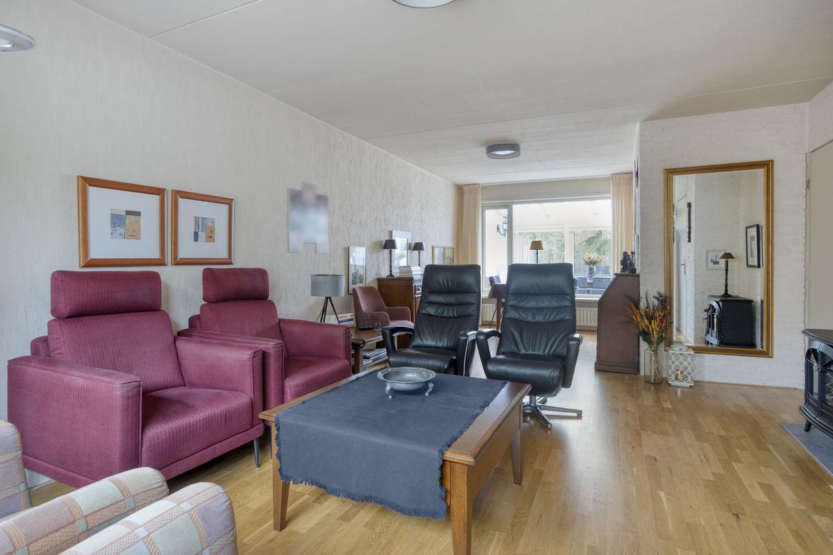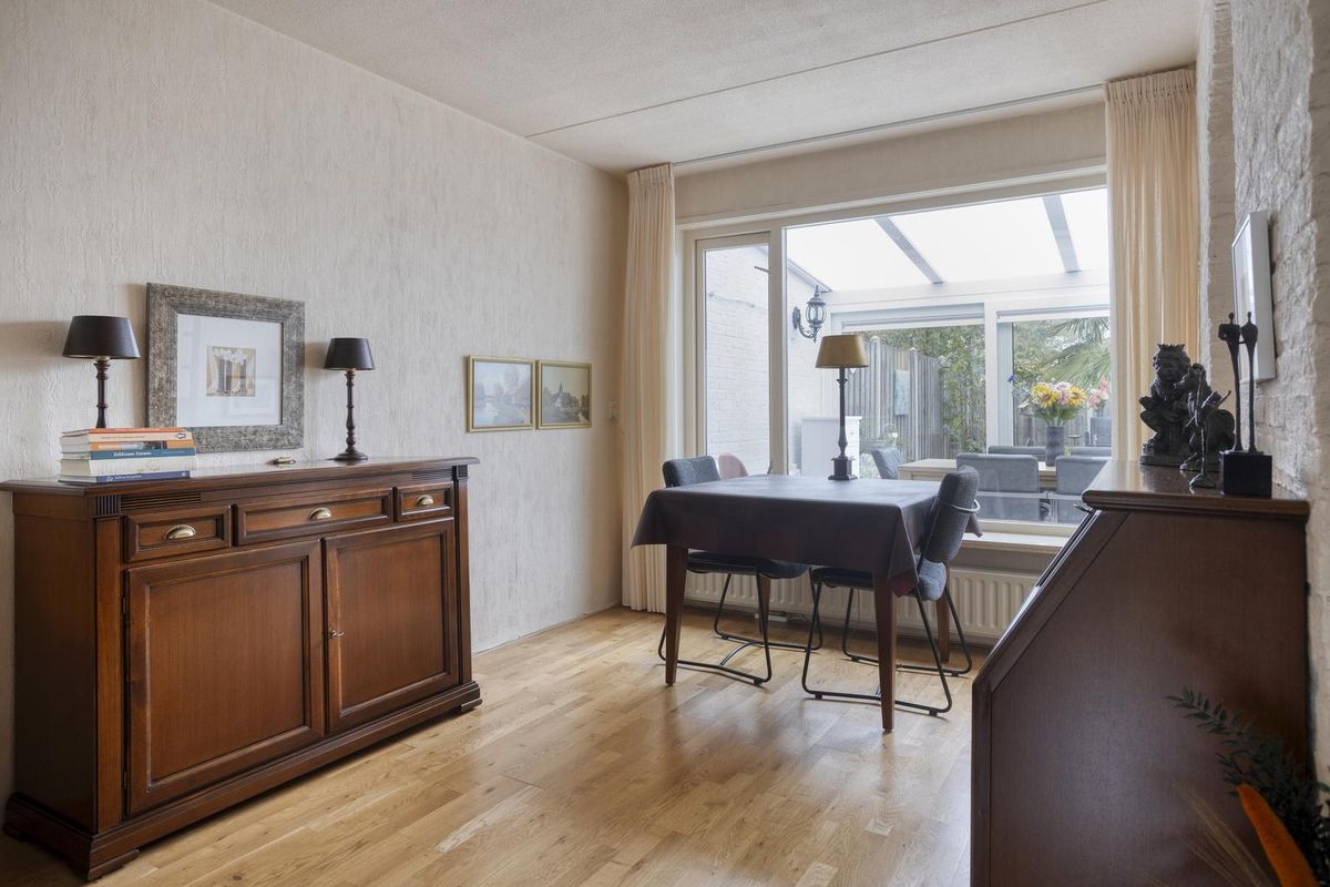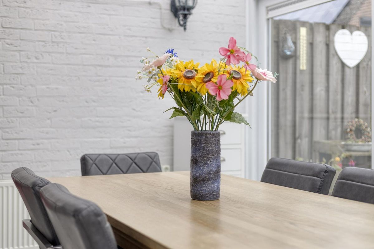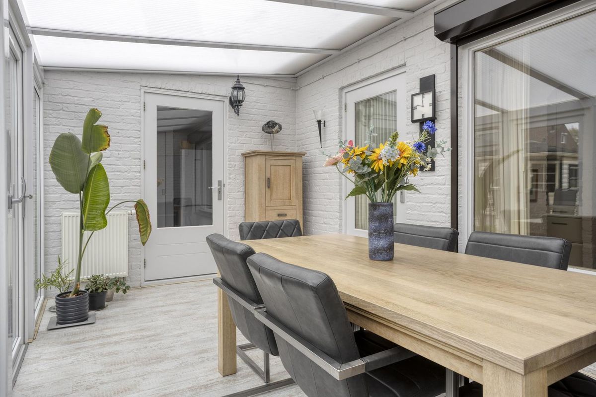De serre is een heerlijke plek om het hele jaar door te genieten. Dankzij de verwarming, laminaatvloer en het zonnescherm is het hier zowel in de zomer als winter goed toeven. Vanuit de serre bereik je de bijkeuken, waar ruimte is voor de wasmachine en droger en waar praktische inbouwkasten extra opbergruimte bieden. Vanuit hier stap je direct de garage in, die voorzien is van elektra en een elektrische deur – ideaal voor gemak en comfort.