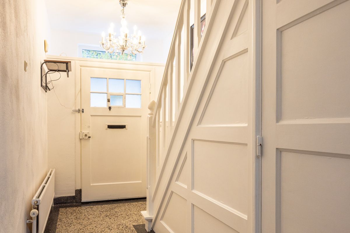 Bij aankomst parkeer je op de eigen oprit, met directe toegang tot de inpandige garage. Via de voordeur kom je binnen in de hal met een fraaie terrazzo vloer. Vanuit hier bereik je de woonkamer, de trap naar boven, de werkkamer en de kelder.