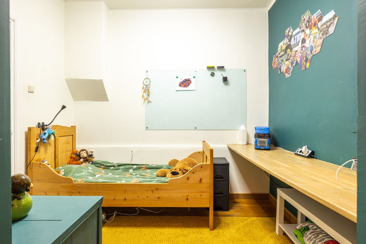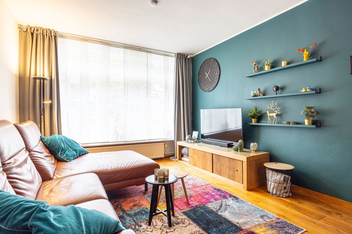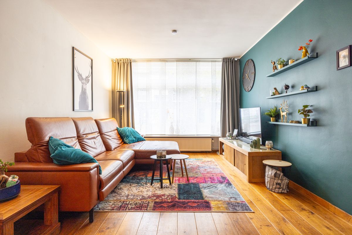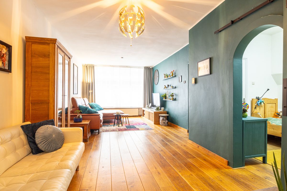De woonkamer heeft een warme uitstraling dankzij de parketvloer en het vele daglicht. Vanuit de zithoek is er een directe doorgang naar de werkkamer, handig voor thuiswerk, studeren of als speelkamer voor de kinderen.