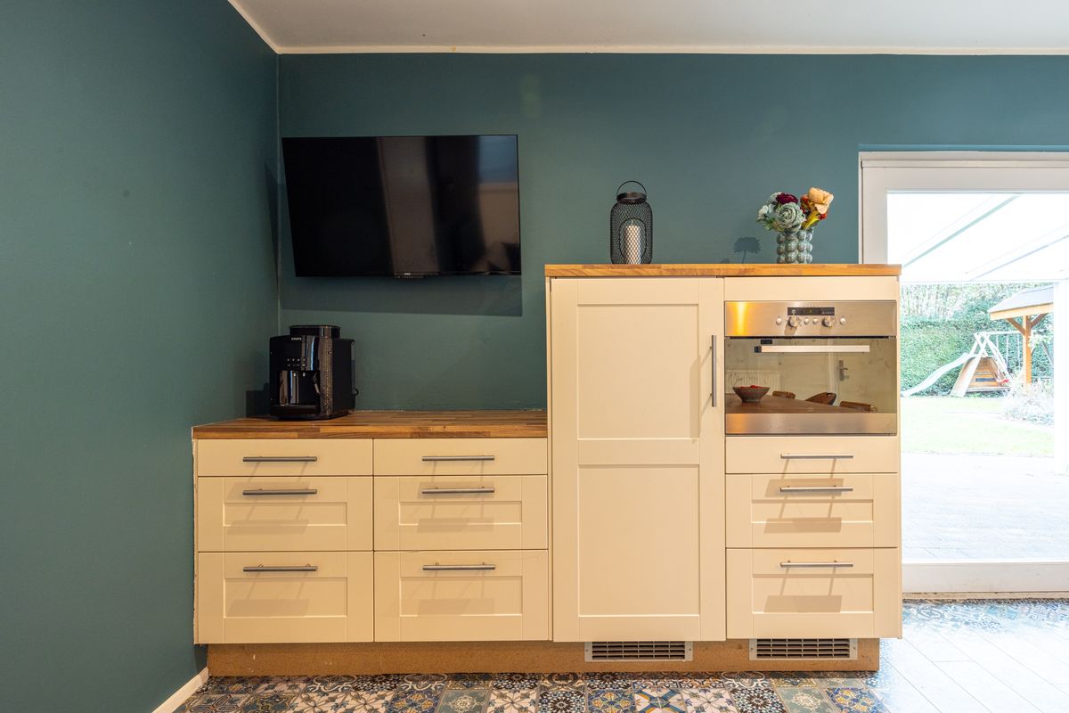 Binnen merk je direct hoe ruimtelijk het huis aanvoelt. De woonkamer loopt door naar een grote leefkeuken waar plek is voor lange ontbijtsessies, knutselmomenten met de kinderen en gezellige avonden met familie of vrienden. Dankzij de schuifpui valt er veel daglicht binnen en staat de tuin altijd in verbinding met het woondeel.
