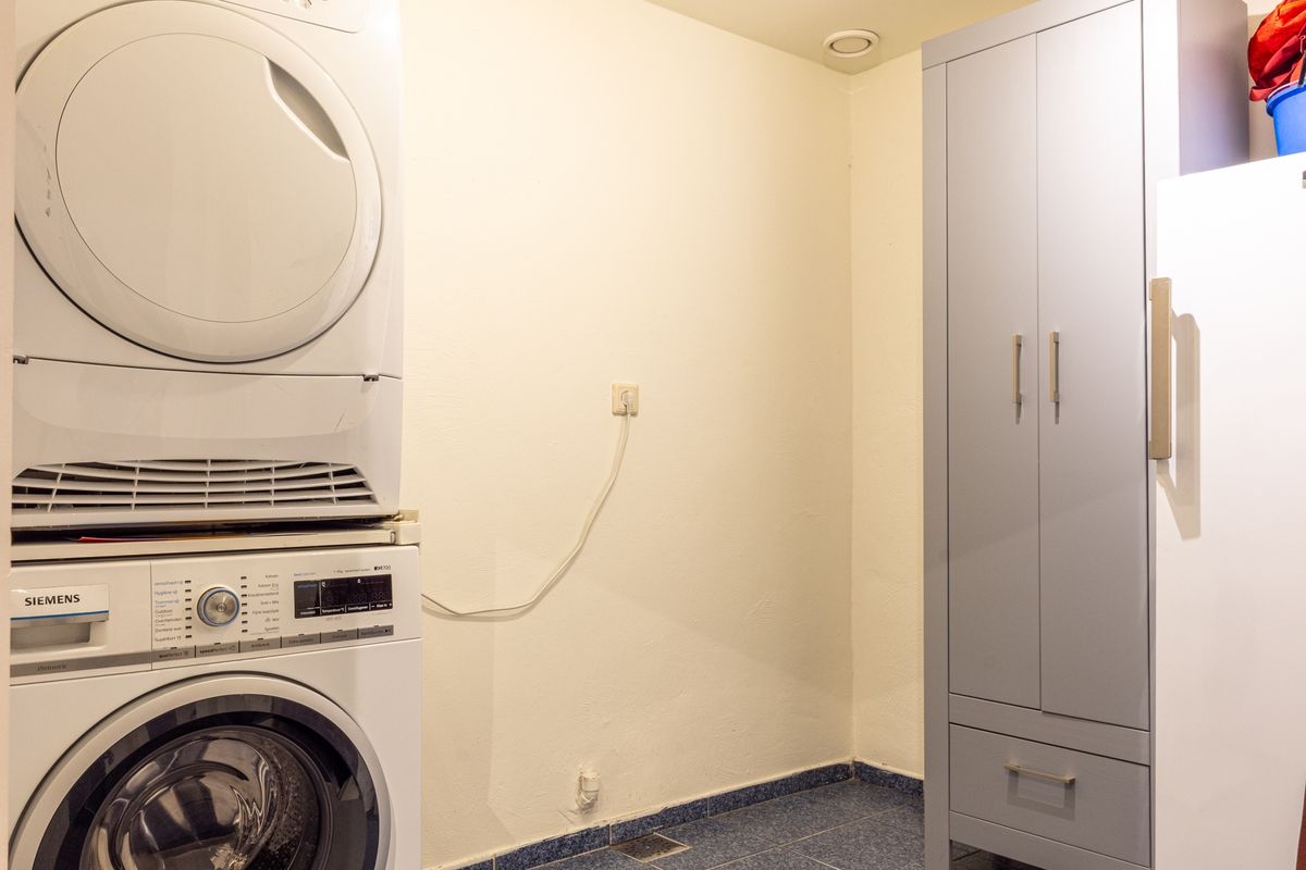 Aangrenzend bevindt zich de bijkeuken met witgoedaansluitingen en toegang tot het toilet met fonteintje. Daarnaast is er de doorgang naar de inpandige garage met twee sectionale poorten, elektra-aansluitingen en plek voor een auto én opslag.