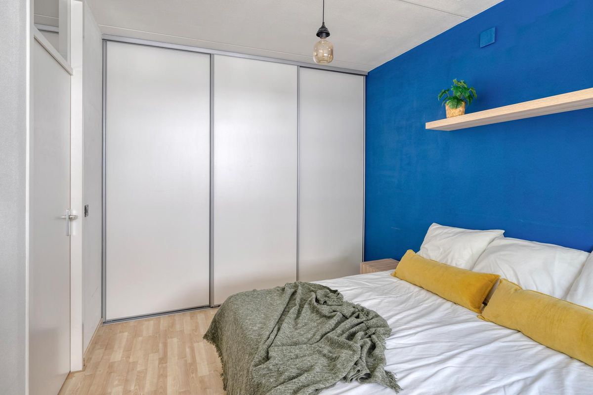 De slaapkamer straalt rust uit en biedt dankzij de vaste schuifkastenwand meer dan genoeg bergruimte.