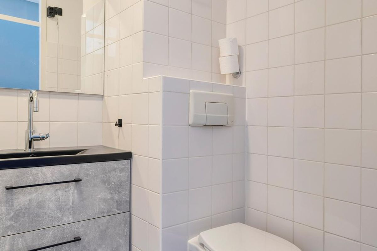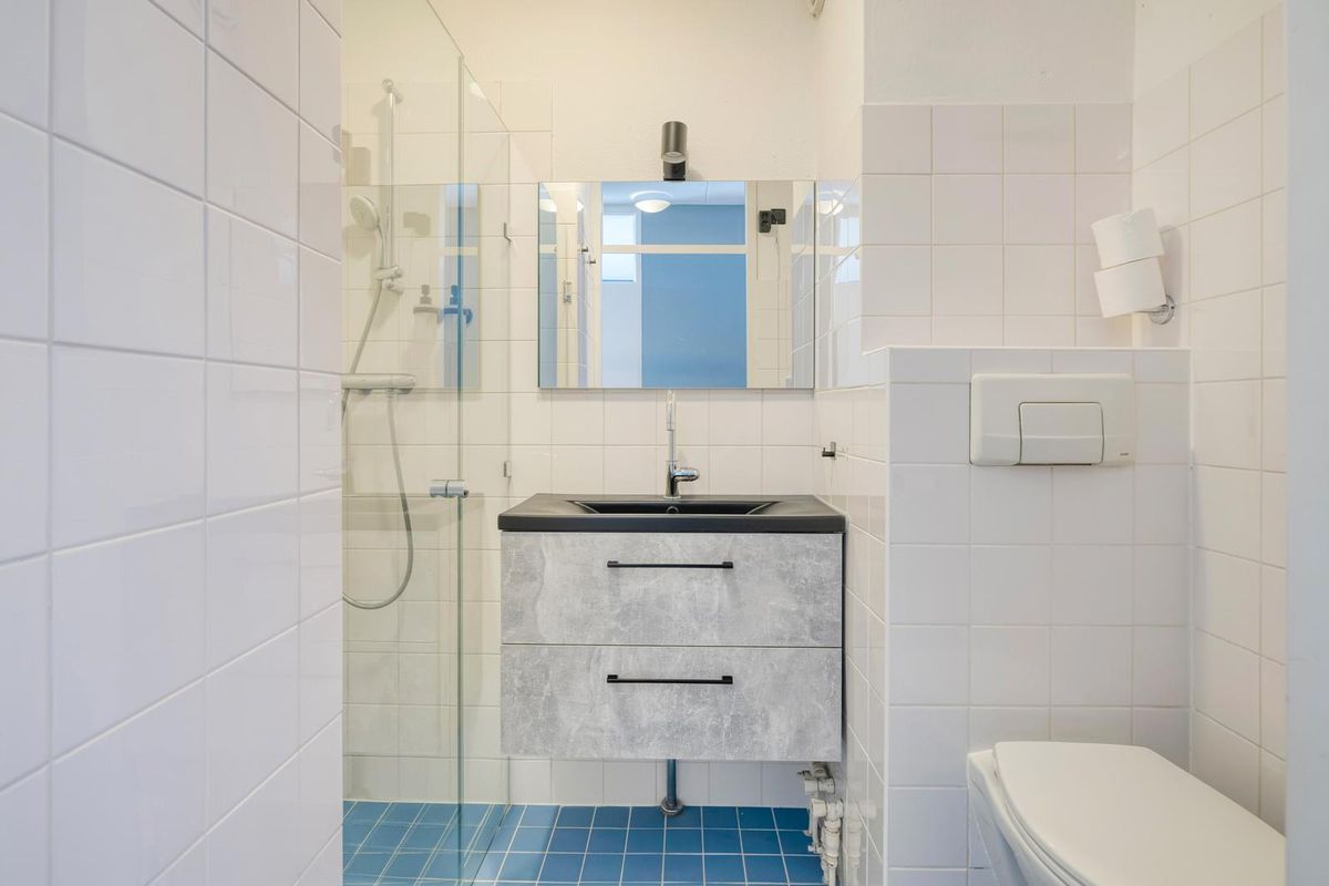 De badkamer is compact en van alle gemakken voorzien. Je vindt er een douche, wastafel en modern hangtoilet.