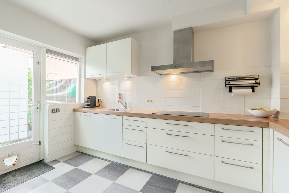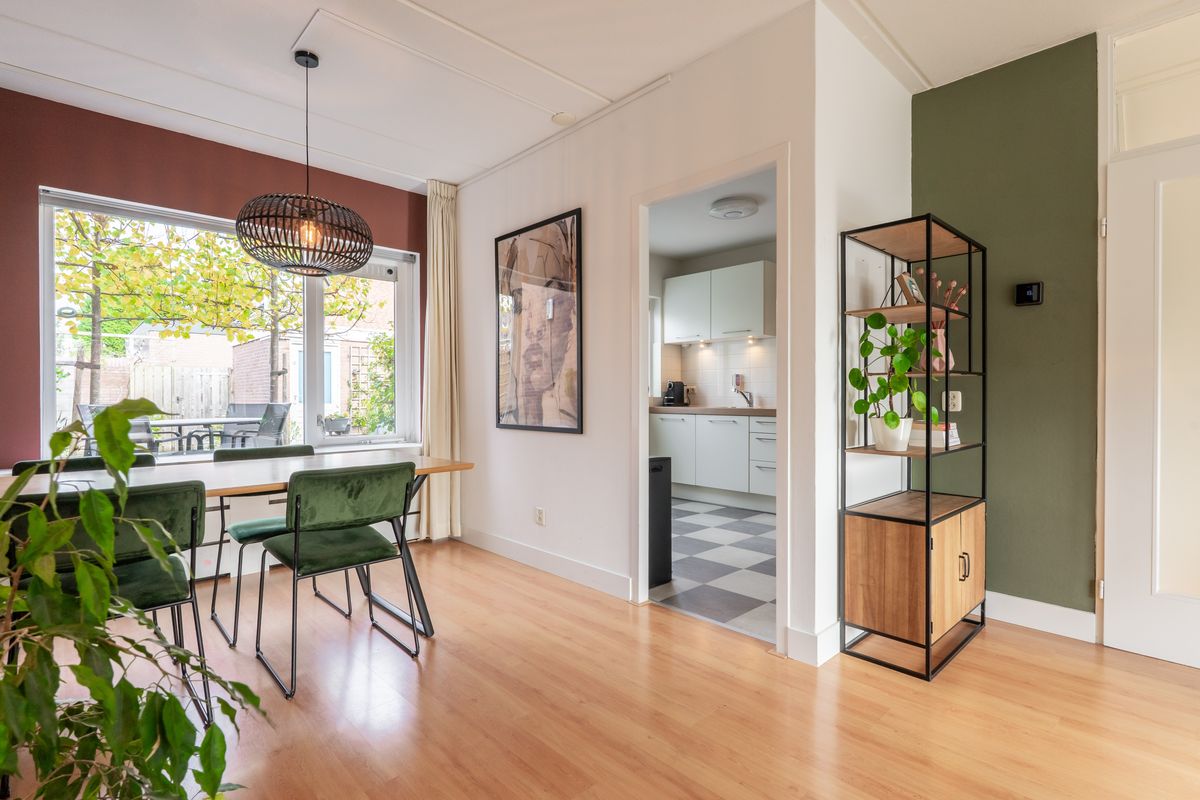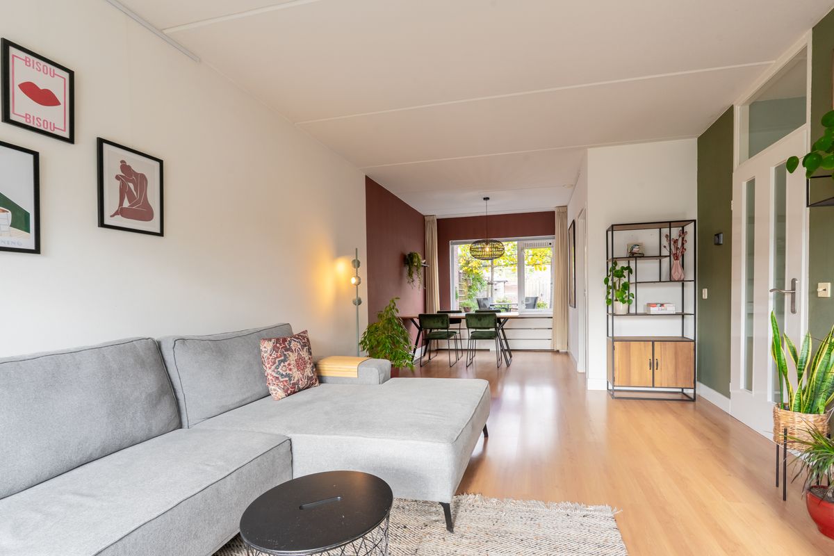 Begane grond: Entree, hal, modern toilet met fonteintje, meterkast, trapopgang, woonkamer, keuken voorzien van keramisch kookplaat, afzuigkap, oven, vaatwasser, vriezer en koelkast, toegang tot de zonnige achtertuin met berging en achterom.