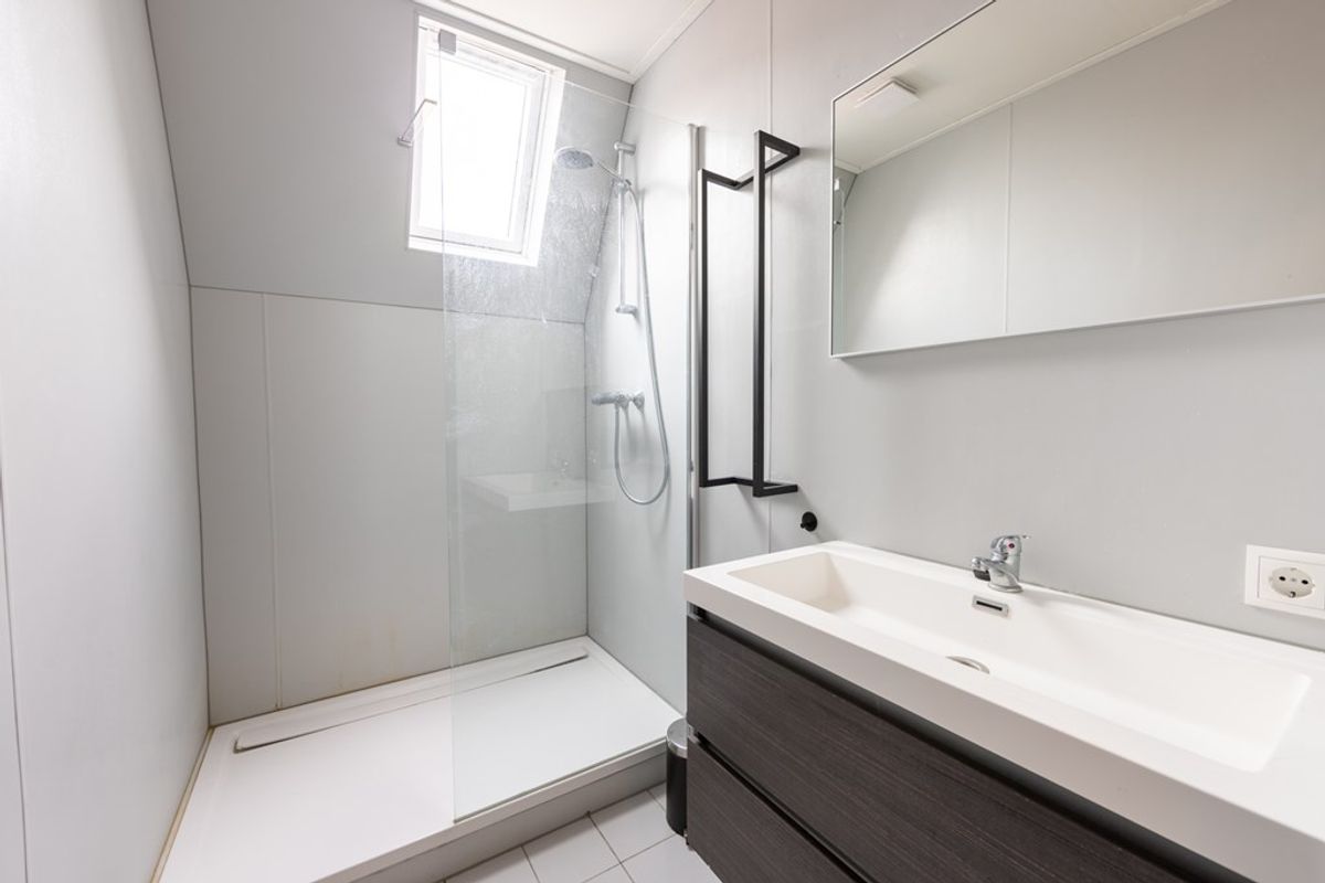 De moderne badkamer is voorzien van een ruime douche, een wastafelmeubel en een toilet. Naast de badkamer bevindt zich de slaapkamer.