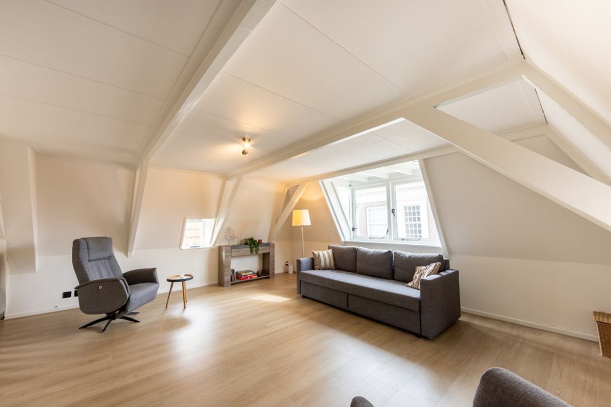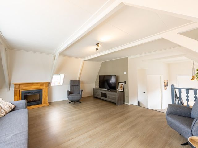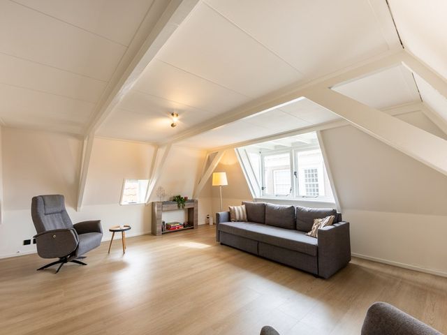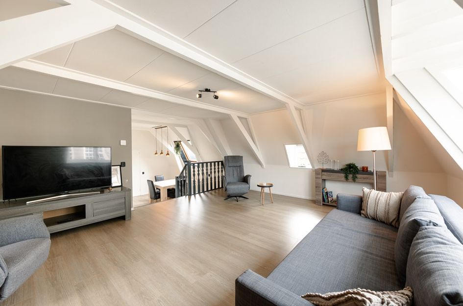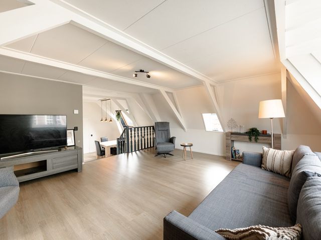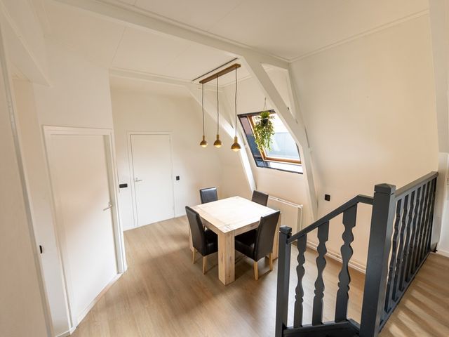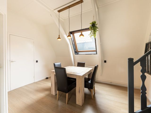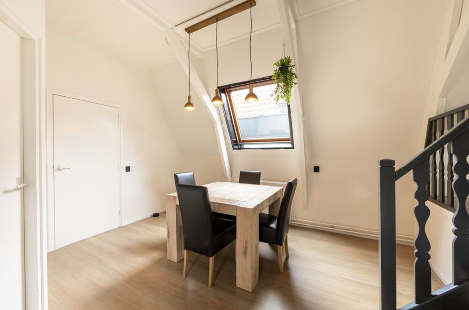 De ruime en gezellige woonkamer heeft een grote dakkapel en een eetgedeelte met een moderne, halfopen keuken met inbouwapparatuur.