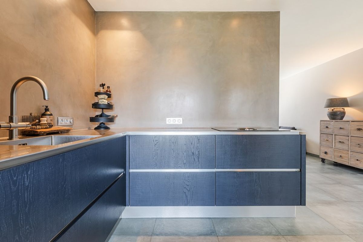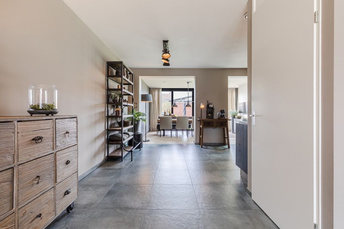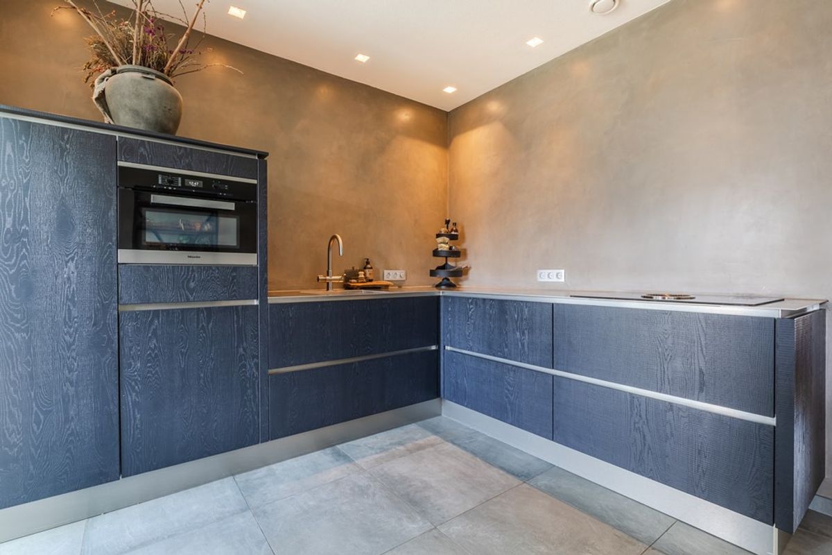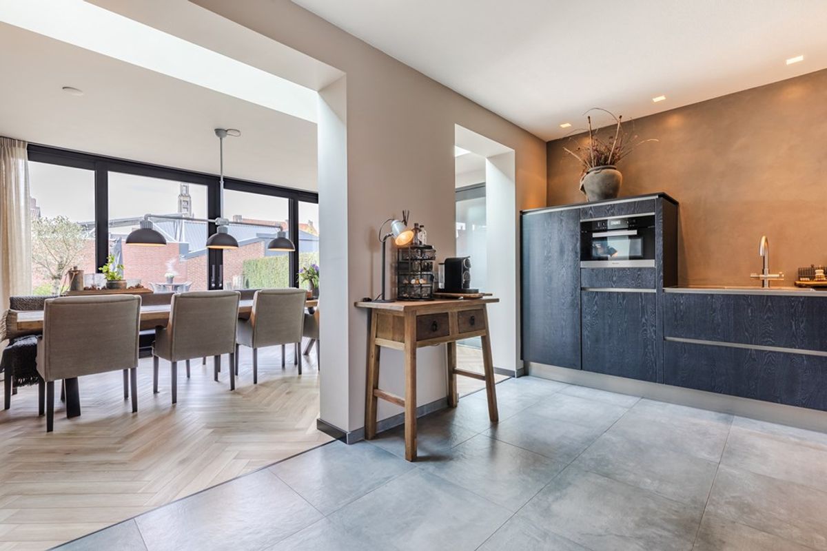 De aanbouw/eetkamer is voorzien van een fraaie pvc-vloer, uitgevoerd in visgraatmotief, een lichtstraat en een dubbele schuifpui. De open keuken beschikt over een luxe inbouwkeuken, v.v. alle (voornamelijk Miele) apparatuur, waaronder een Bora kookplaat met afzuigsysteem, combimagnetron, koelkast, vaatwasser en een kokend waterkraan.