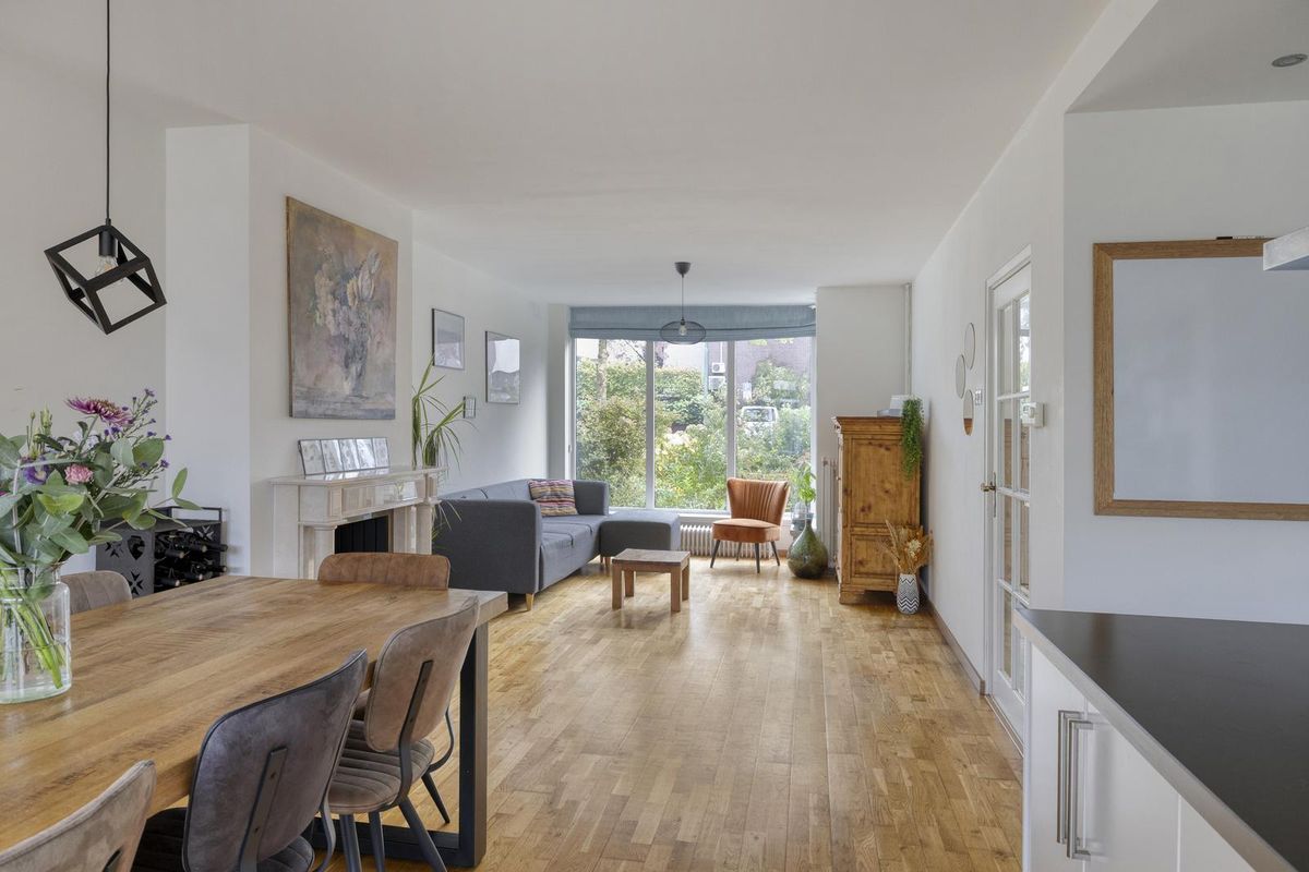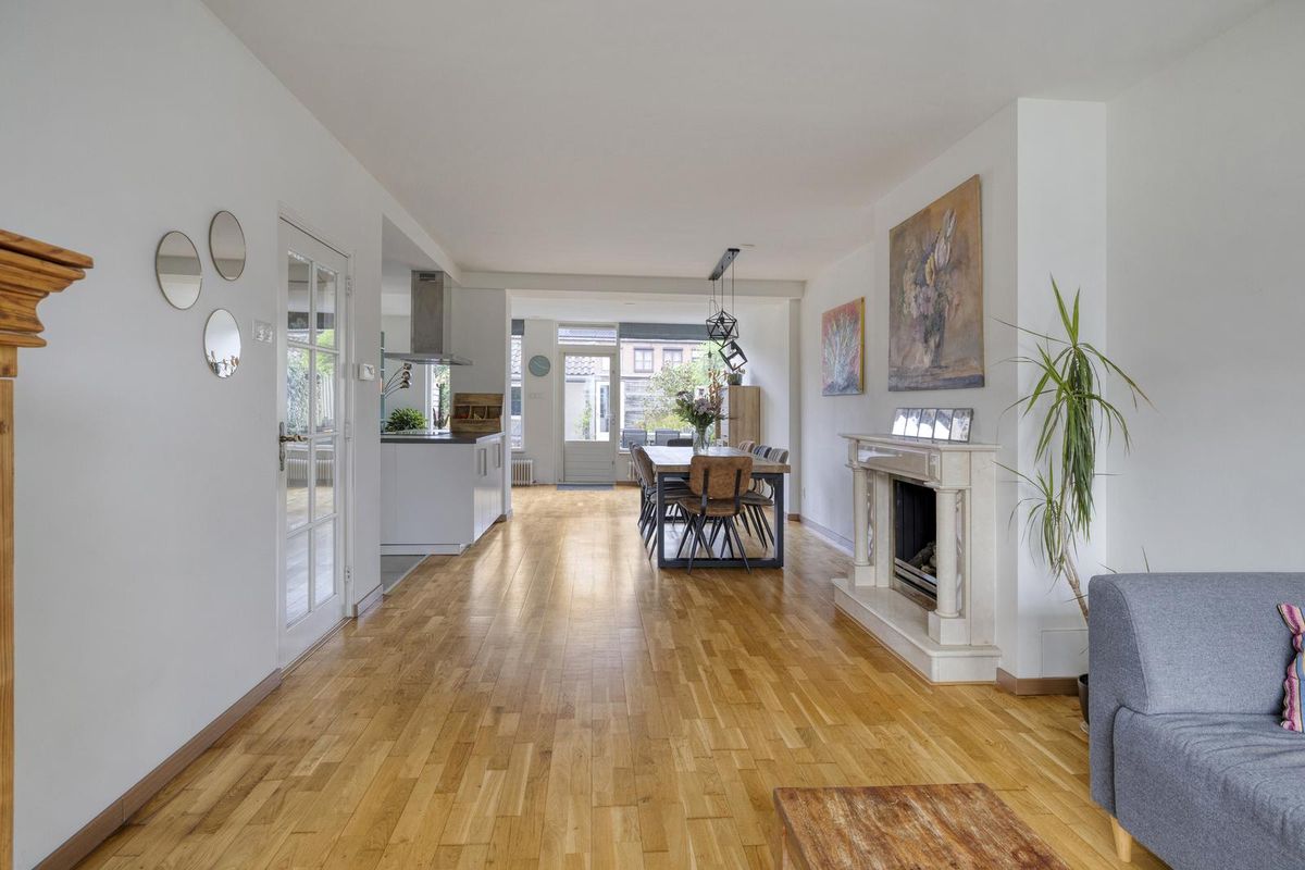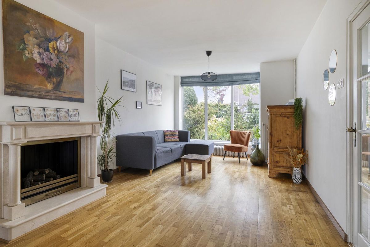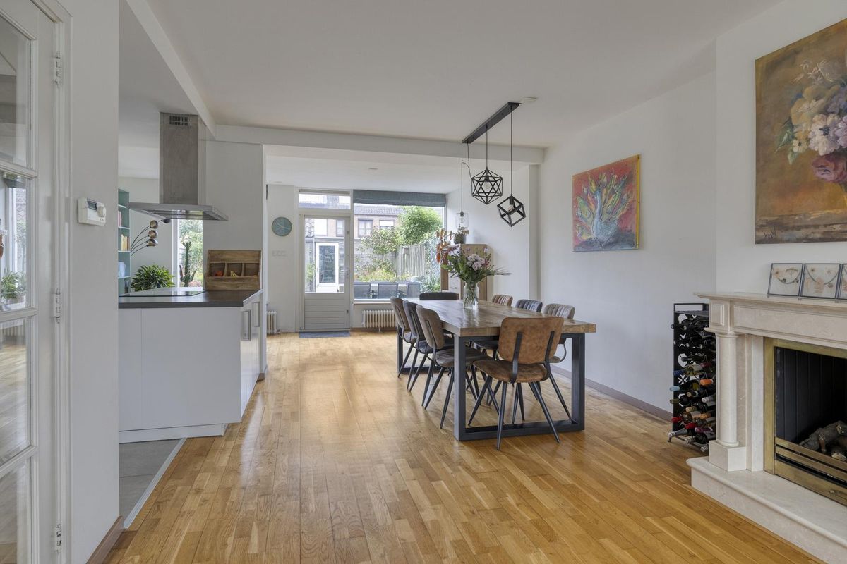De woonkamer en keuken zijn in totaal circa 54 m² groot. De woonkamer heeft een sierhaard. De uitgebouwde woonkamer is voorzien van een parketvloer en geeft via een deur toegang tot de achtertuin.
