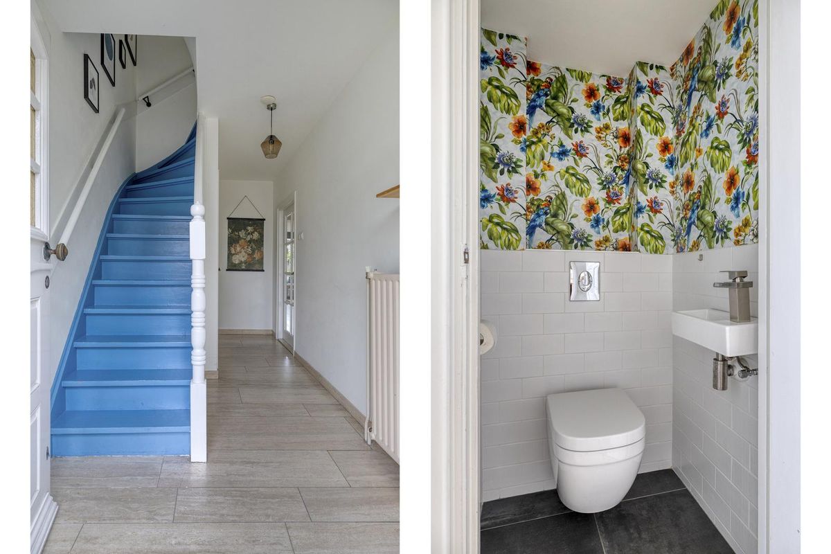 De half betegelde, moderne toiletruimte (2022) is voorzien van een zwevend toilet en een fonteintje.