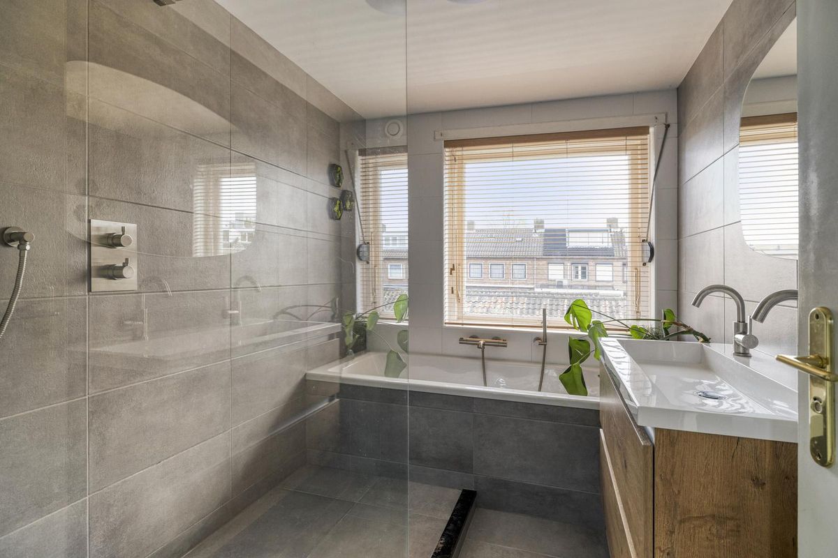 De betegelde moderne badkamer (2022) heeft een ligbad, een inloopdouche, een wastafelmeubel (met twee kranen) en een designradiator.