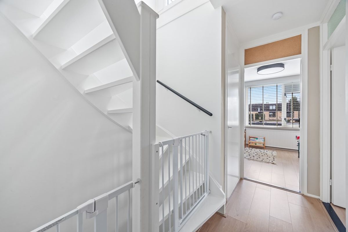 De eerste verdieping is bereikbaar via de hal naast de keuken, in de hal is een separaat toilet. Op de overloop van de 1e verdieping is een diepe bergkast, direct rechts bovenaan de trap is de gemoderniseerde badkamer welke is voorzien van een bad, een inloopdouche, een wastafelmeubel en een tweede toilet. Verder bevinden zich op de 1e verdieping 3 ruime slaapkamers, van respectievelijk ca. 12m2 , 13m2 en 9m2.