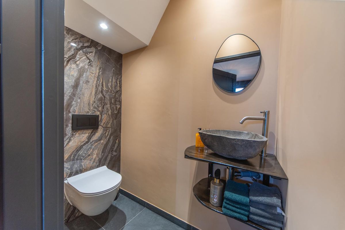 In de hal vinden we een toiletruimte met hangcloset en een speels fonteintje terug, die ook weer op zeer fraaie wijze is afgewerkt met een kunststof plaat met marmermotief. De (recent aangepaste) meterkast waar we meer dan genoeg groepen aantreffen om alles in huis op de juiste wijze van stroom te voorzien en een trapkast waar u vele (schoonmaak)spulletjes kwijt kunt. In de trapkast zit ook het kruipluik, dat naar de goed geïsoleerde kruipruimte leidt.