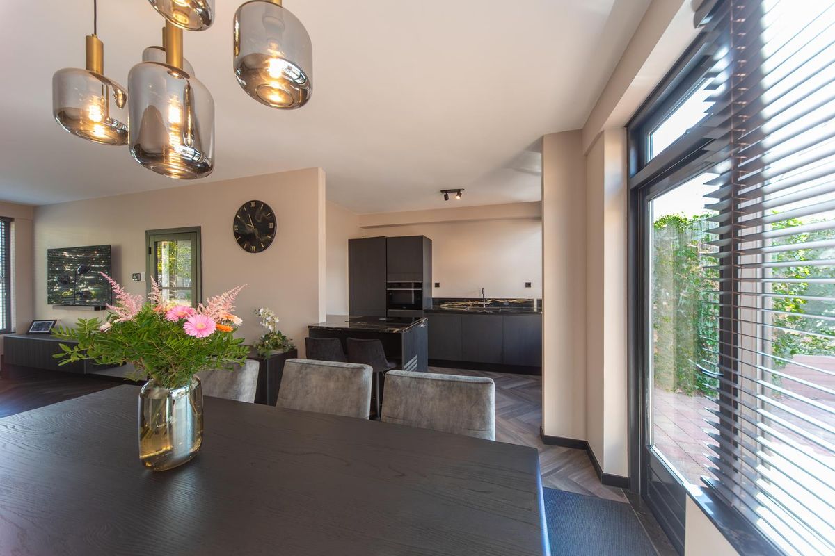 Als we de woonkamer binnenkomen, ademt alles sfeer en warmte uit, van de moderne shutters voor de grote ramen voor en achter, de zwarte afwerking op kozijnen, deuren en moderne meubels, de grote zwarte eetkamertafel met royale stoelen waar u uren op kunt zitten tijdens een diner met vrienden of familie.