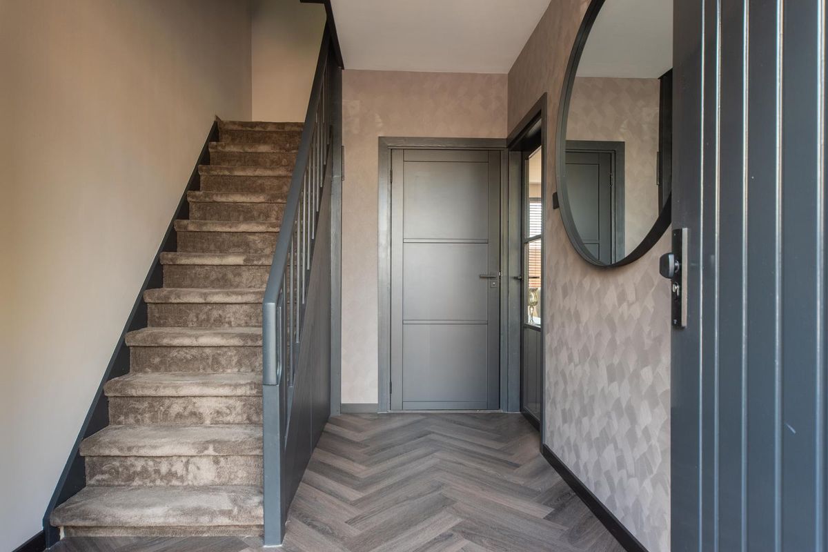 Als we de woning betreden via de voordeur, komen we uit in de statige hal, waar direct de pvc-visgraatvloer in het oog springt.