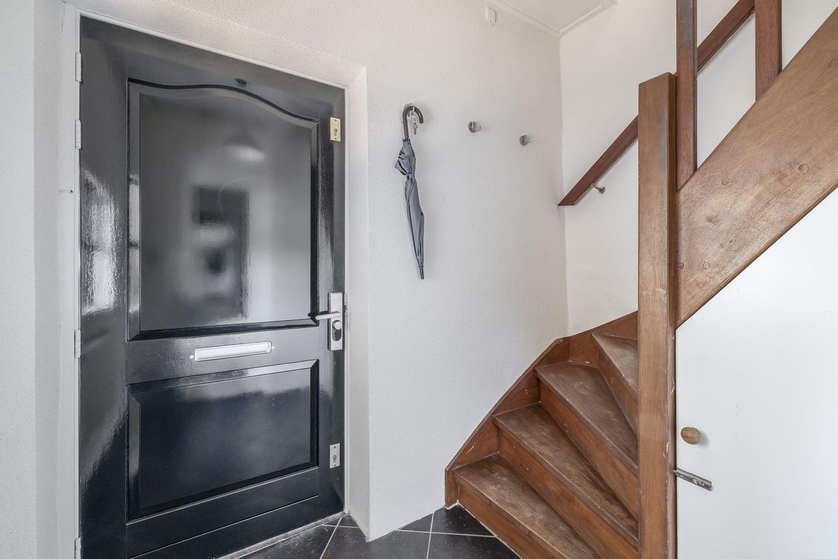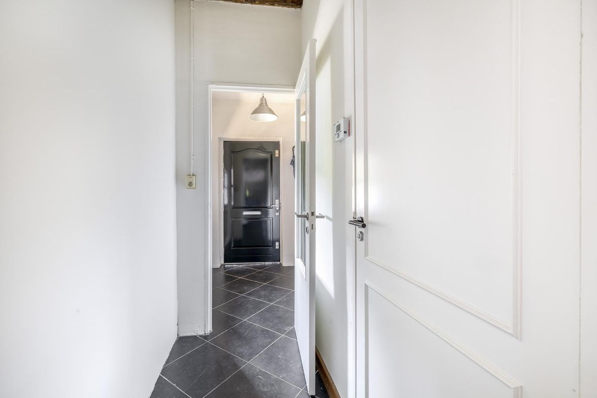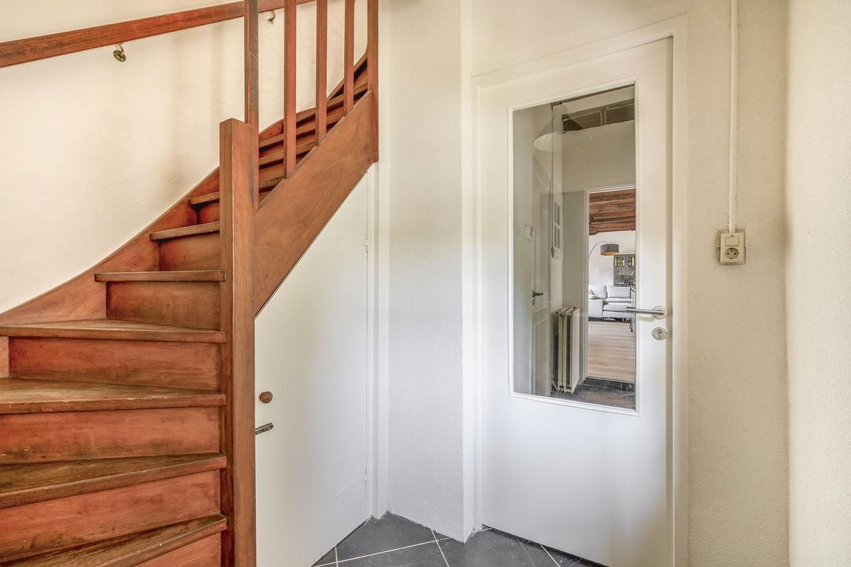 Bij binnenkomst komt u in de hal met een nette, betegelde vloer. Hier bevindt zich de vaste trap naar de eerste verdieping, inclusief handige trapkast. Via een tweede halletje bereikt u het separate toilet, voorzien van een hangend toilet, urinoir en fonteintje. Ook is hier de opstelplaats van de HR-combiketel te vinden. Vanuit de eerste hal heeft u toegang tot het leefgedeelte.