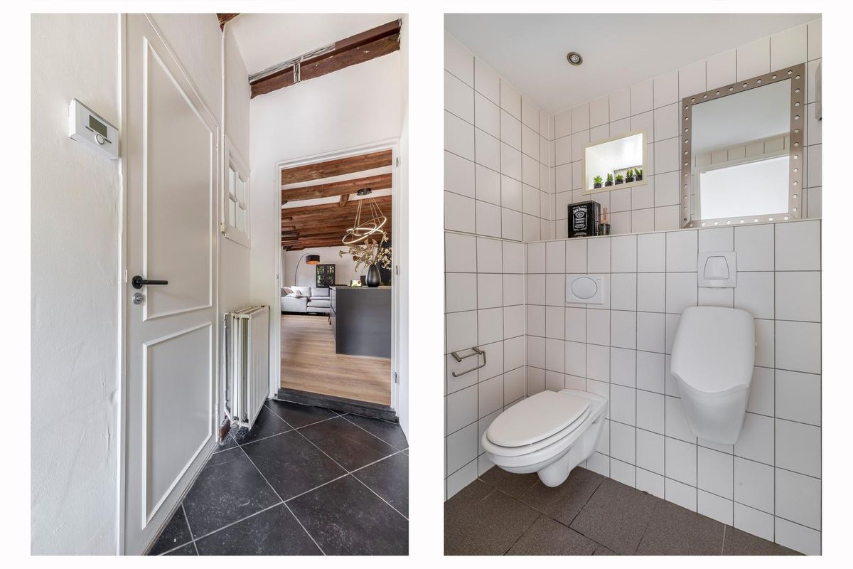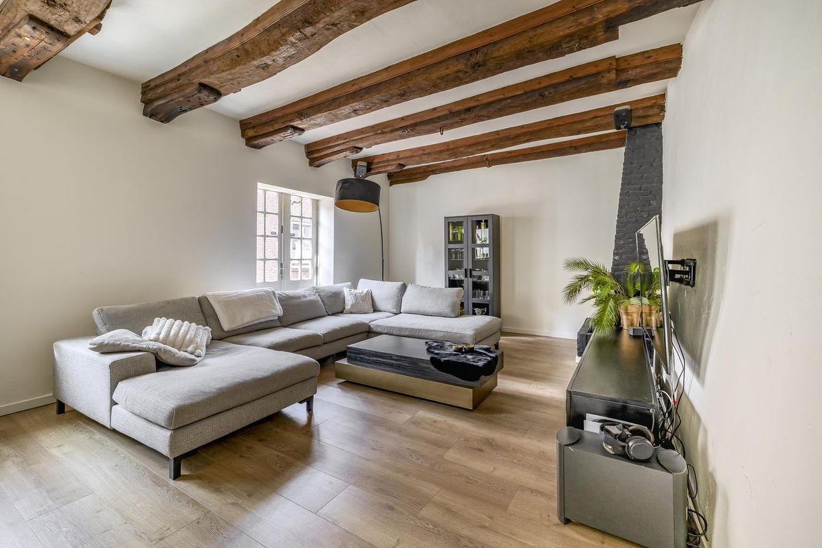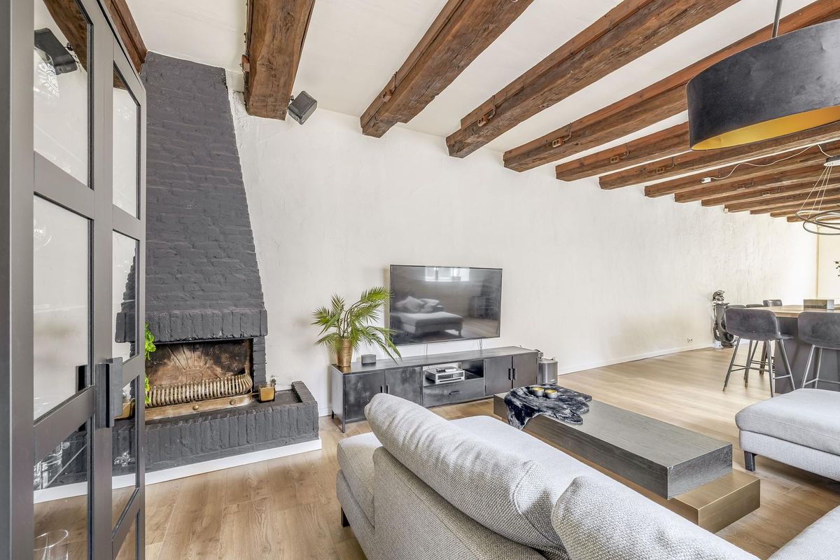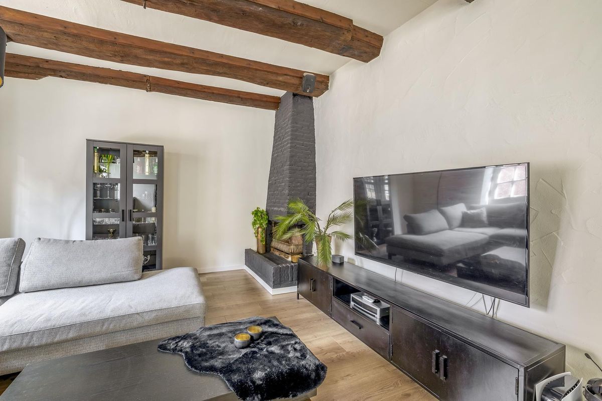De living is smaakvol afgewerkt en voorzien van een nette laminaatvloer met comfortabele vloerverwarming. De karakteristieke houten balken in het plafond trekken direct de aandacht en dragen bij aan de warme, authentieke sfeer van de ruimte. Dankzij de grote raampartijen en openslaande deuren is het leefgedeelte heerlijk licht. Deze fantastische sfeervolle living nodigt, door het balkenplafond en de openslaande deuren, uit tot optimaal ontspannen of het ontvangen van gasten! In de woonkamer is tevens de meterkast gesitueerd, evenals een schoorsteen die uitnodigt tot het creëren van een gezellige zithoek.