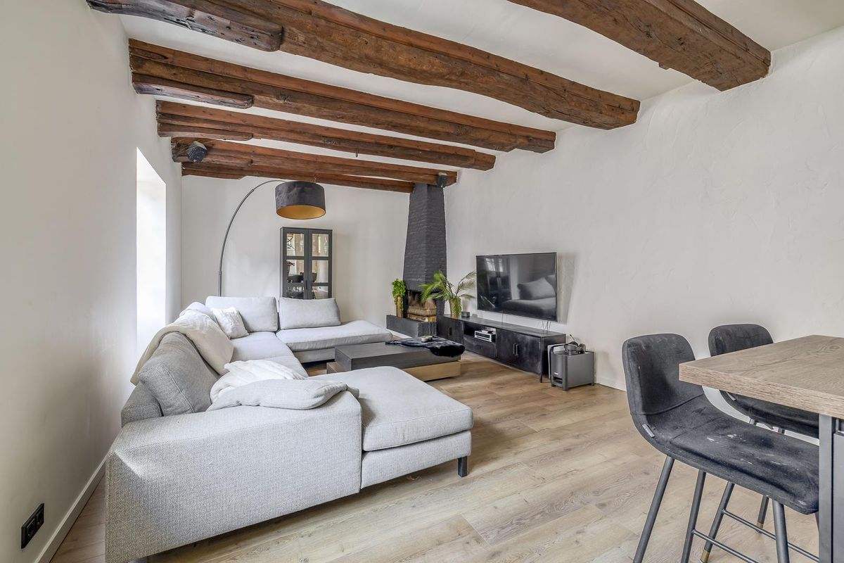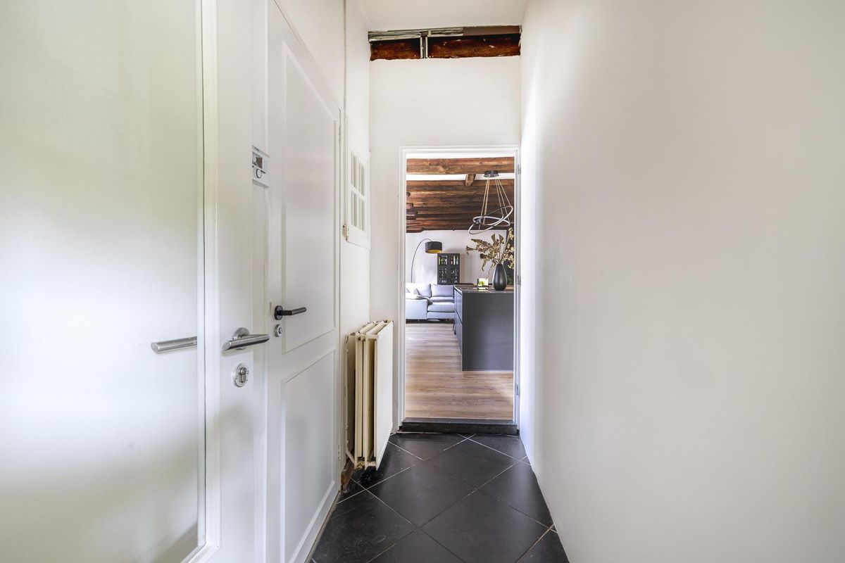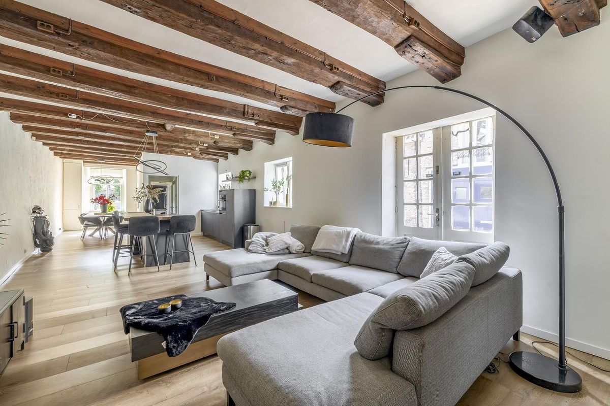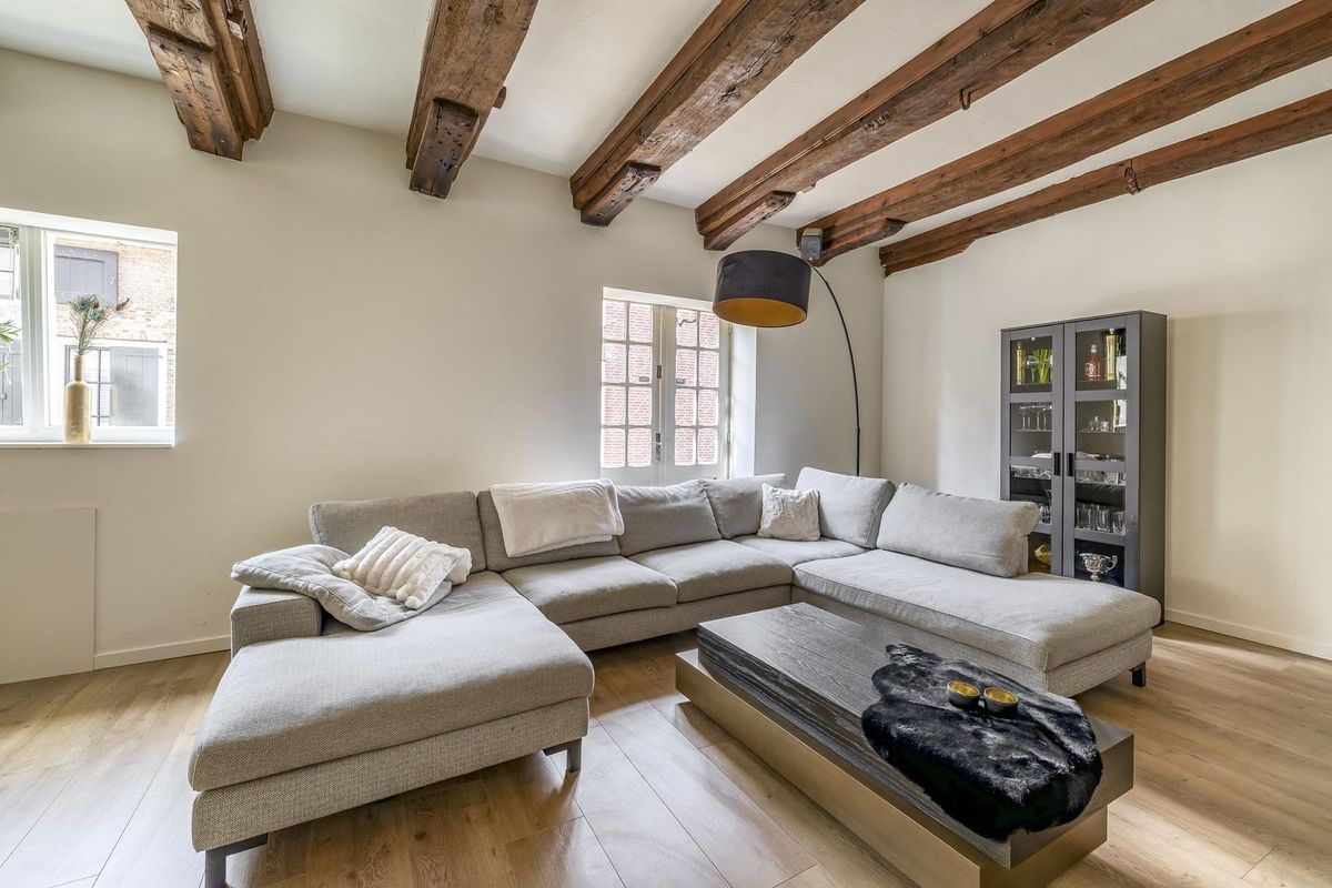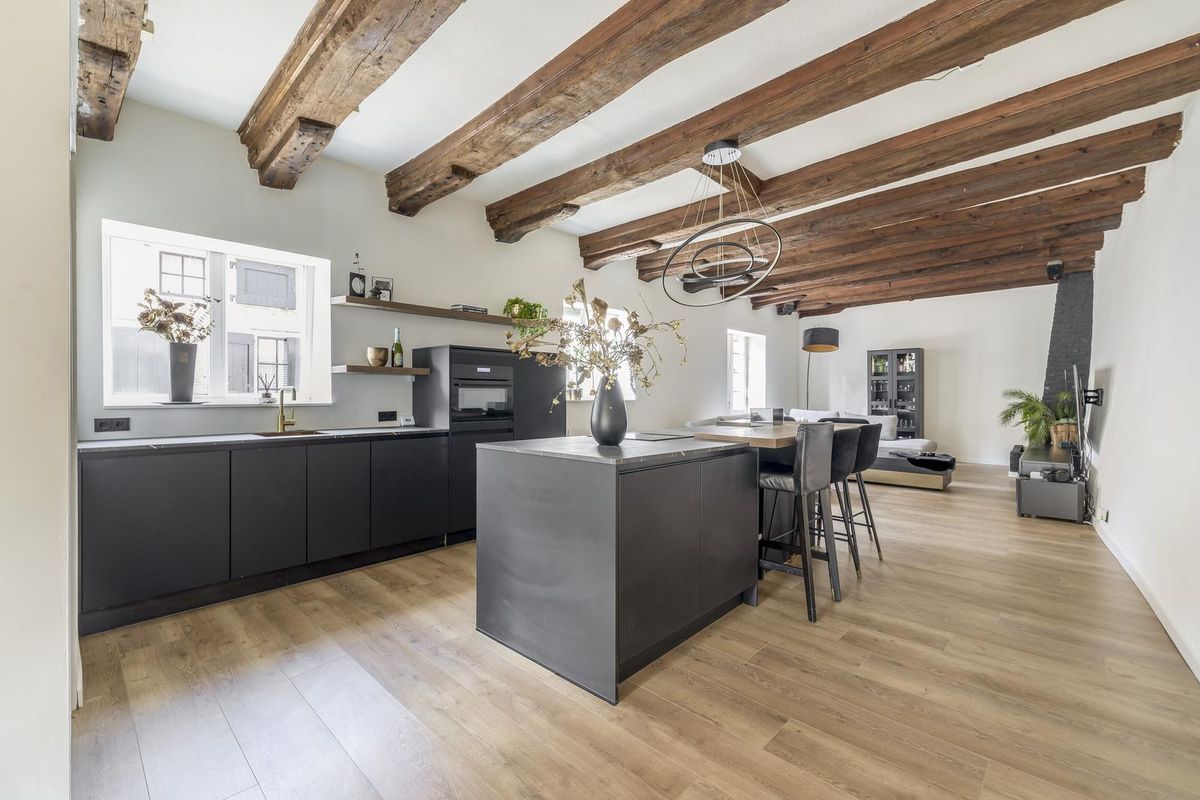 De living is smaakvol afgewerkt en voorzien van een nette laminaatvloer met comfortabele vloerverwarming. De karakteristieke houten balken in het plafond trekken direct de aandacht en dragen bij aan de warme, authentieke sfeer van de ruimte. Dankzij de grote raampartijen en openslaande deuren is het leefgedeelte heerlijk licht. Deze fantastische sfeervolle living nodigt, door het balkenplafond en de openslaande deuren, uit tot optimaal ontspannen of het ontvangen van gasten! In de woonkamer is tevens de meterkast gesitueerd, evenals een schoorsteen die uitnodigt tot het creëren van een gezellige zithoek.