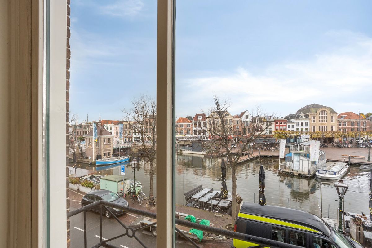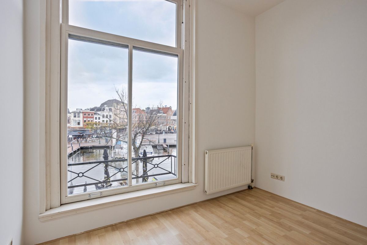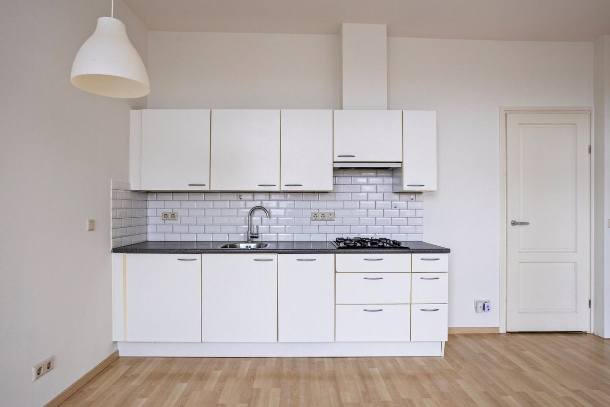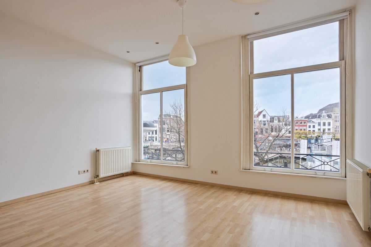 Aan de rechterzijde bevindt zich de lichte woonkamer met open keuken. De grote ramen zorgen niet alleen voor een prettige lichtinval, maar ook voor een mooi uitzicht over de Beestenmarkt en de Blauwpoortsbrug. De schuiframen geven het appartement bovendien een charmante, authentieke uitstraling. De open keuken is voorzien van een vaatwasser, koelkast, gaskookplaat en voldoende opbergruimte. Aangrenzend bevindt zich een inbouwkast met de cv-ketel en de aansluiting voor de wasmachine, plus extra opbergruimte.