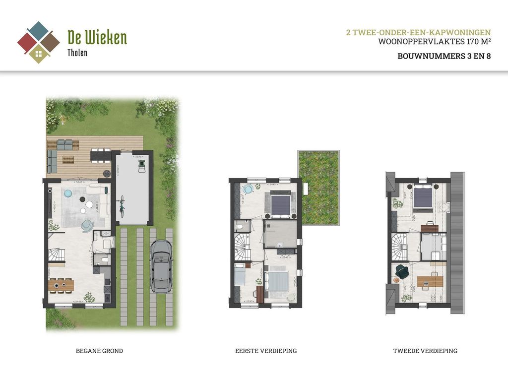 Bouwnummer 8 maakt deel uit van de acht halfvrijstaande woningen in De Wieken. Het asymmetrische ontwerp met dwarskap zorgt voor een onderscheidend gevelbeeld en een statige uitstraling, terwijl de tuin aan drie zijden volop licht en privacy biedt. De woning beschikt over een ruime kavel van ca. 309 m2.