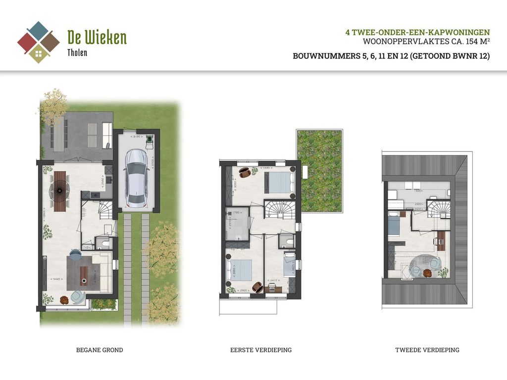 Bouwnummer 12 heeft een symmetrisch ontwerp, waarbij de linker- en rechterwoning aan elkaar gespiegeld zijn. De woning beschikt over drie woonlagen, een aangebouwde garage en een tuin die op drie zijden is georiënteerd. De kavel heeft een oppervlakte van ca. 266 m2. Dit biedt onder ander de mogelijkheid om op eigen terrein te parkeren.