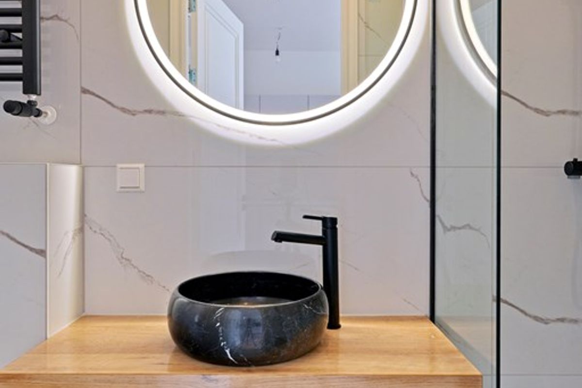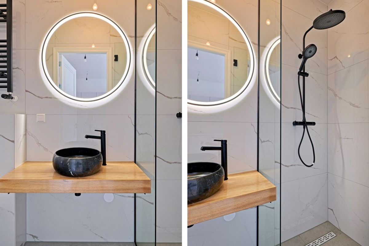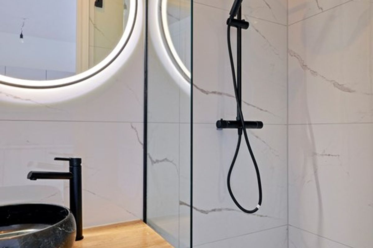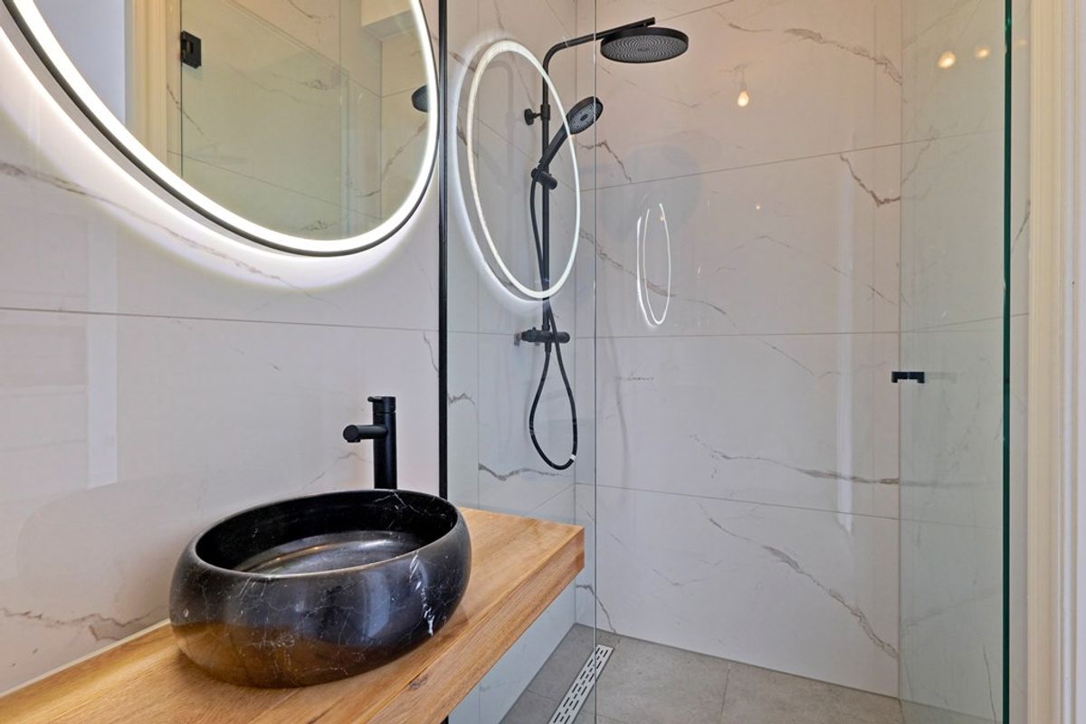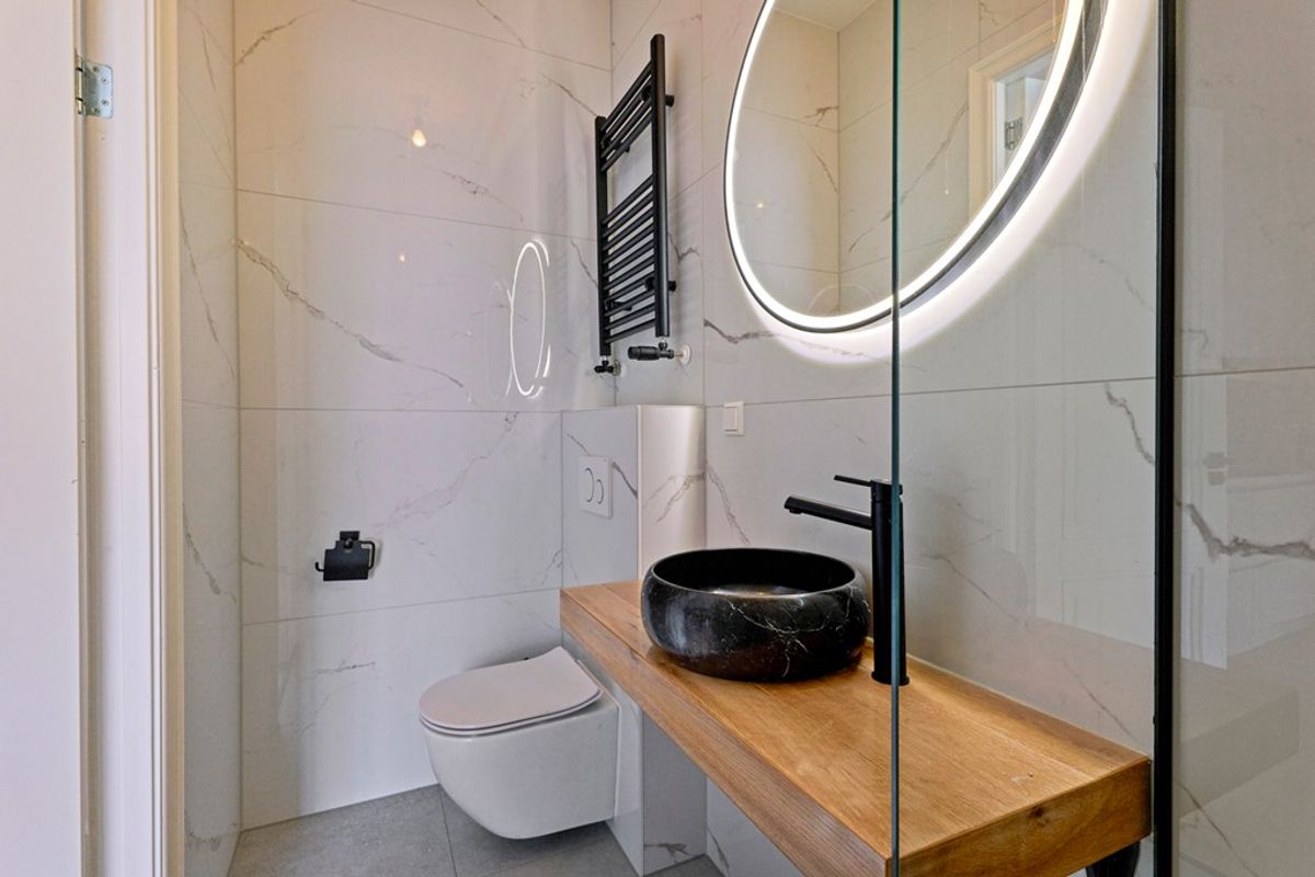 De moderne badkamer is strak en eigentijds uitgevoerd en beschikt over een inloopdouche, een stijlvol wastafelmeubel en een toilet. Alles is met zorg en oog voor detail afgewerkt.