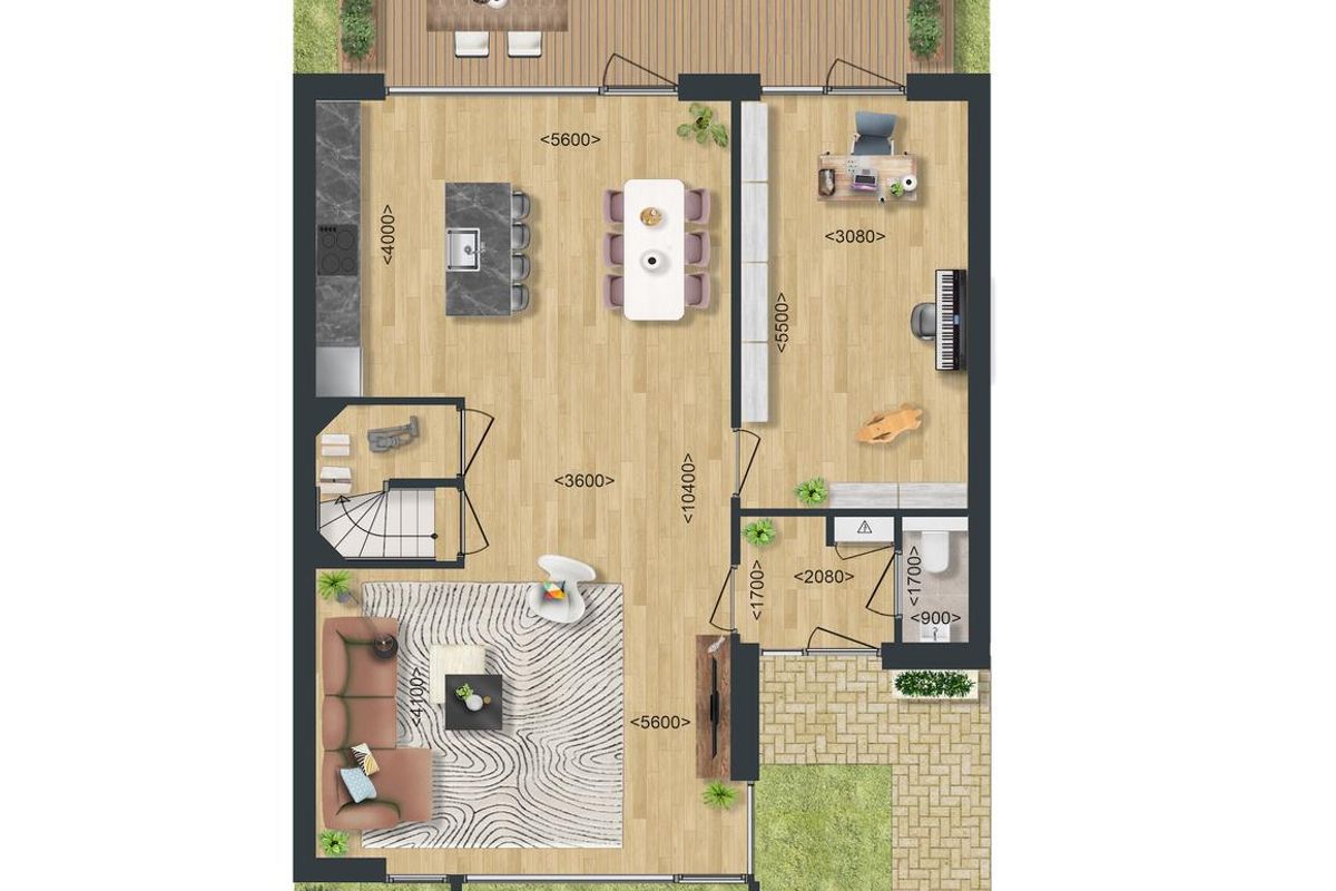 Dit woningtype heeft een zijuitbouw , een extra ruimte op de begane grond, die uitnodigt tot creatieve invulling. Ook zorgt de gesloten trap voor extra bergruimte. Deze deelt tevens de woonruimte praktisch in tweeën.
