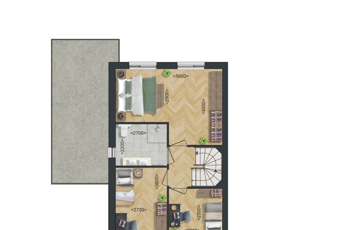 De hal in het hart van de eerste verdieping maakt alle kamers centraal bereikbaar, inclusief de badkamer. In de woningen van dit woningtype is er ruimte voor wel vier slaapkamers of uiteraard kamers met tal van andere functies. De grote slaapkamer benut de volledige breedte van de woning.