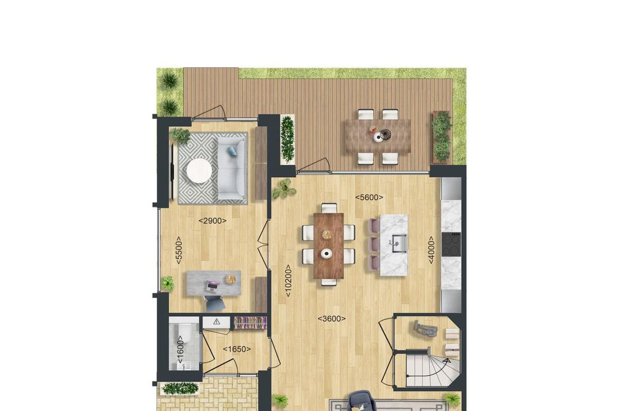 Dit woningtype heeft een zijuitbouw , een extra ruimte op de begane grond, die uitnodigt tot creatieve invulling. Ook zorgt de gesloten trap voor extra bergruimte. Deze deelt tevens de woonruimte praktisch in tweeën.
