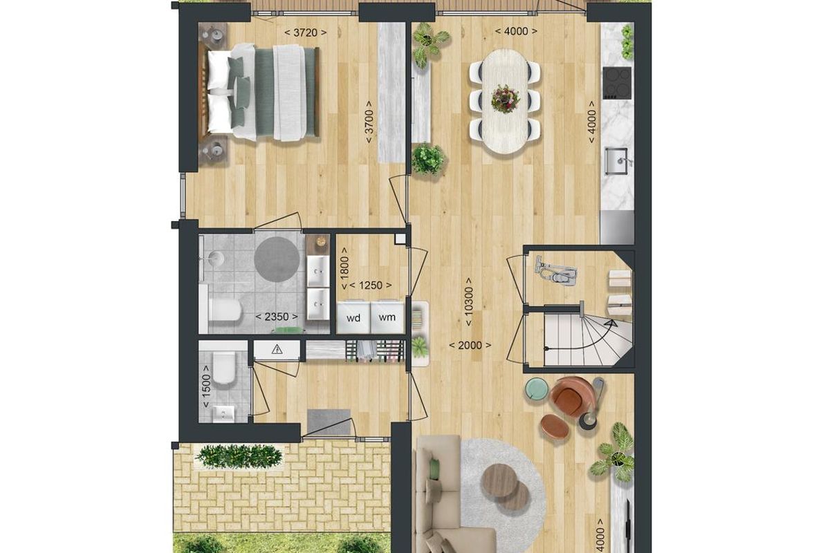 Smart living. Zo kan je type E gerust beschrijven: praktisch en doelmatig. De woonkamer en (eet)keuken zijn beide open en dus lekker ruimtelijk en de trappartij zorgt voor een natuurlijke indeling. Ook zo’n voordeel: de slaapkamer ligt net als de keuken en eetkamer aan het terras.