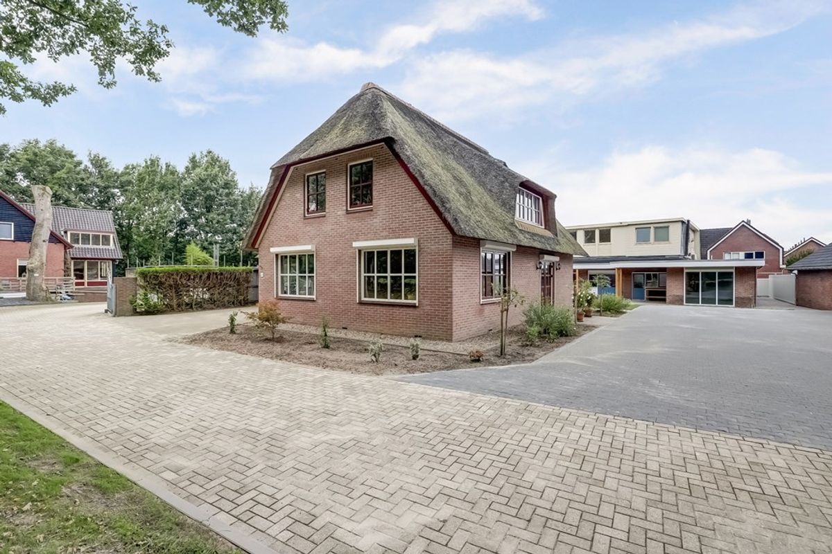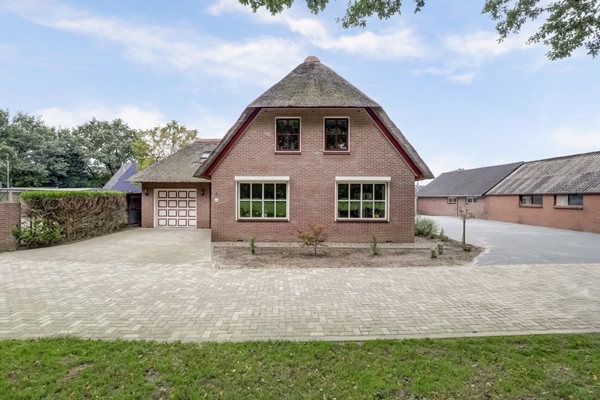 Aan dit deel van de Uddelerweg liggen 6 woningen. Dankzij de ligging aan een rustige straat met enkel bestemmingsverkeer geniet je hier van volop rust en privacy. Nummer 44 is de één na laatste woning. Dit maakt het een bijzonder rustig straatje. Je rijdt de weg op met aan de linkerzijde het weiland. Bijna aan het eind van de straat draai je rechts het erf op. Wat een waanzinnige plek is dit! De vrijstaande woning met de rieten kap is een mooie verschijning.