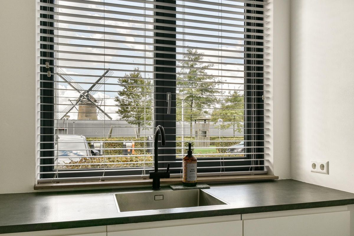 Voortuin met overdekte entree en links van de woning een eigen parkeerplaats. Entree/hal met toilet v.v. wandcloset en fonteintje, meterkast, trapopgang en toegang tot de woonkamer. De woonkamer ligt aan de tuinzijde en beschikt over een trapkast, hierin is een bio ethanol sfeerhaard ingebouwd waar je sfeervol van kunt genieten tijdens het tafelen. Door de brede, hoge raampartijen schijnt er veel daglicht naar binnen. Aan de voorzijde ligt de open keuken. De keuken is uitgerust met een vaatwasser, een inductiekookplaat en een afzuigkap en een apparatenwand met een oven, een combi-oven en een koelkast. Door de vele lades is er veel bergruimte. De keuken biedt een mooi uitzicht op de Mallemolen. Op de gehele begane grond ligt een industriële tegelvloer met vloerverwarming.