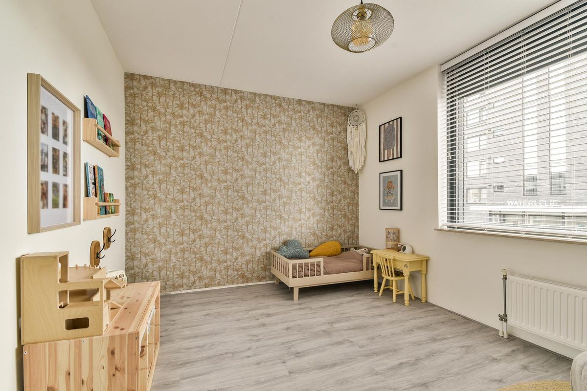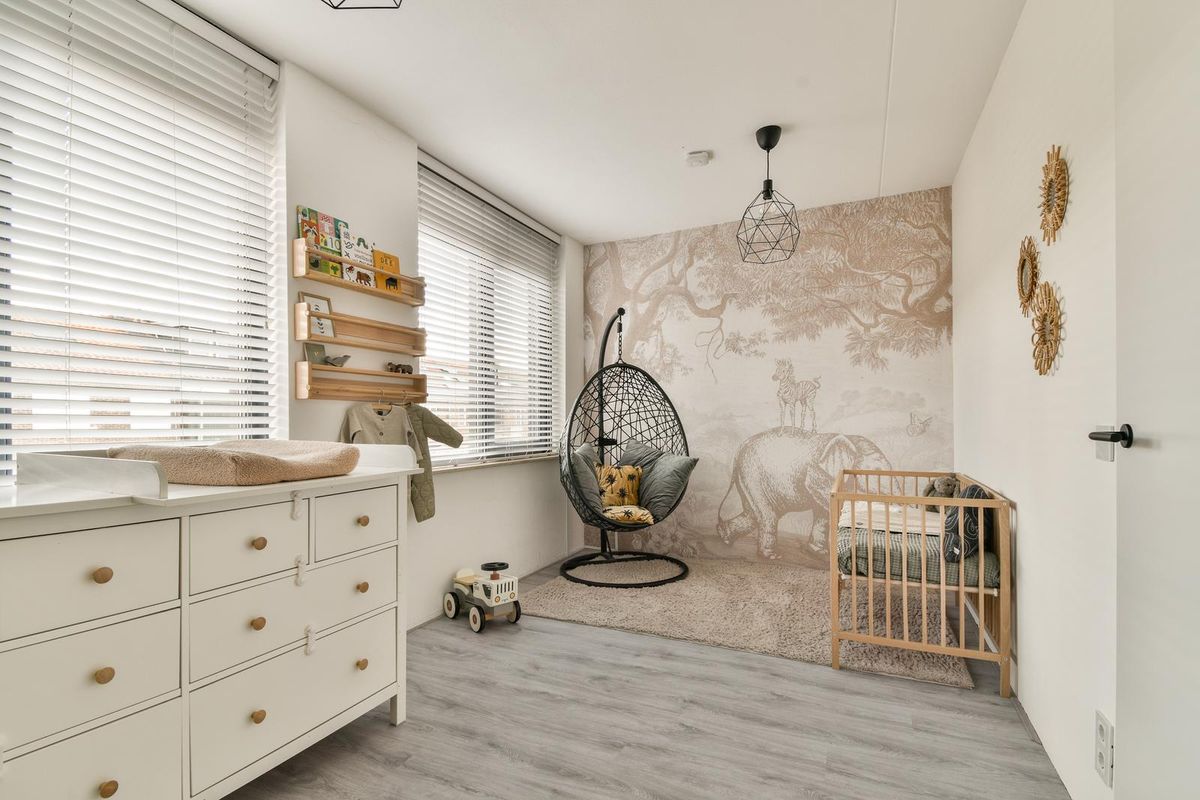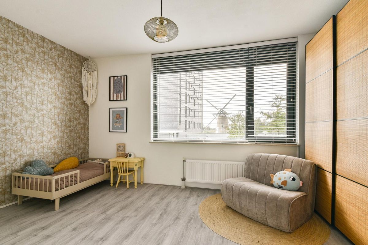 Overloop met wasmachine-aansluiting en toegang tot twee slaapkamers. De grootste slaapkamer ligt aan de voorzijde en loopt over de gehele breedte. De andere slaapkamer ligt aan de achterzijde en biedt toegang tot een inpandige berging met daarin de CV-ketel, de warmtepomp, de WTW-unit en de omvormer van de zonnepanelen. Tevens is er vanuit deze kamer toegang tot het dakterras. Het terras ligt net als de tuin op het oosten en biedt een leuk uitzicht op de wijk. Alle ramen op deze verdieping zijn voorzien van elektrische rolluiken en horren en op de gehele verdieping ligt een laminaatvloer.