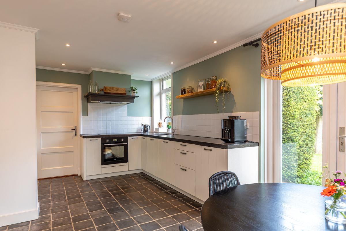 De moderne woonkeuken met vloerverwarming is uitgerust met een vaatwasser, inductiekookplaat, oven, afzuigkap en koelkast, de openslaande deuren zorgen voor veel licht en toegang tot de tuin.