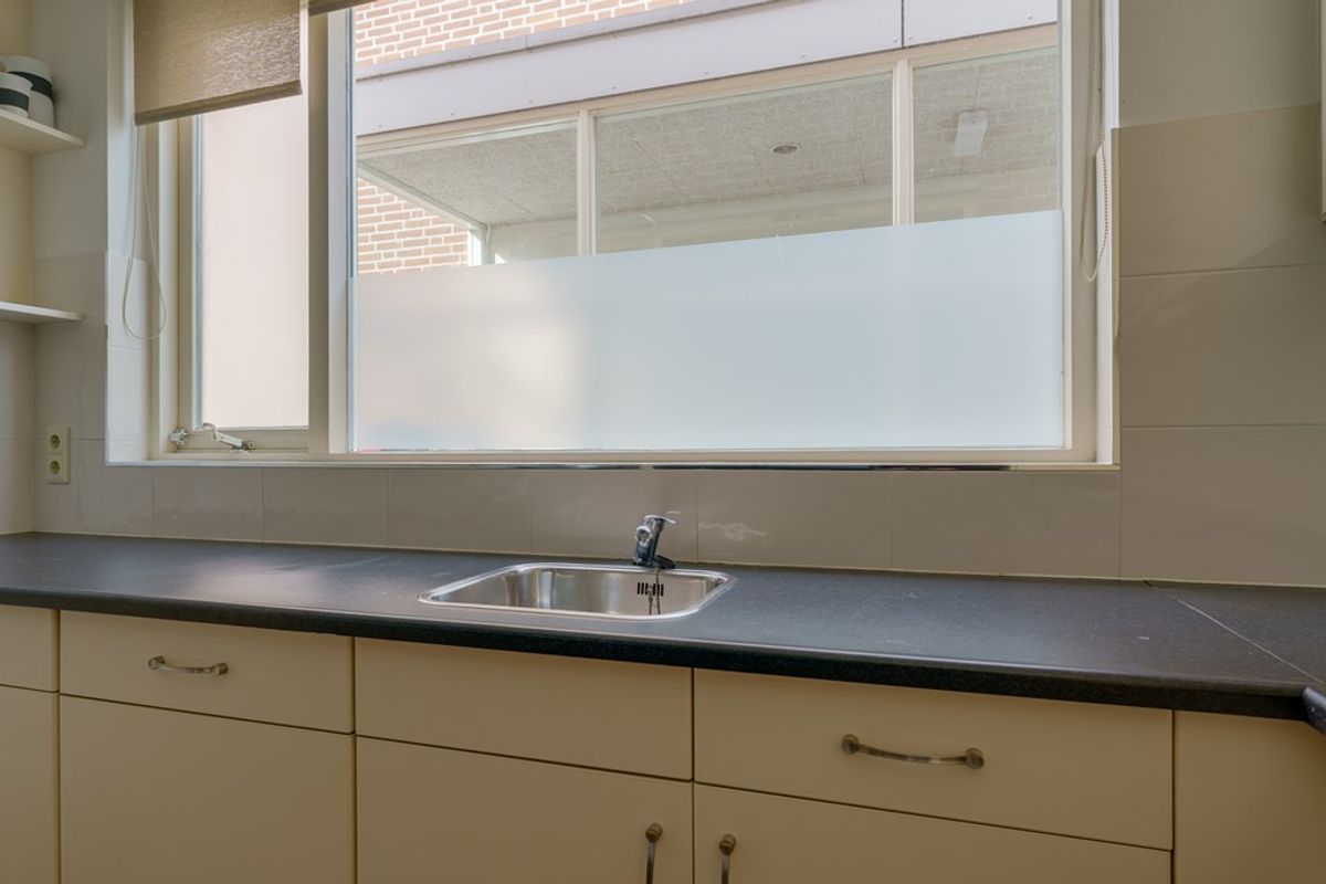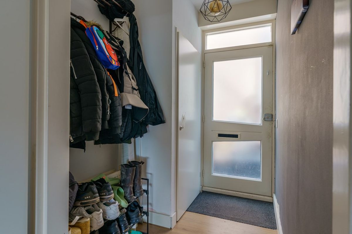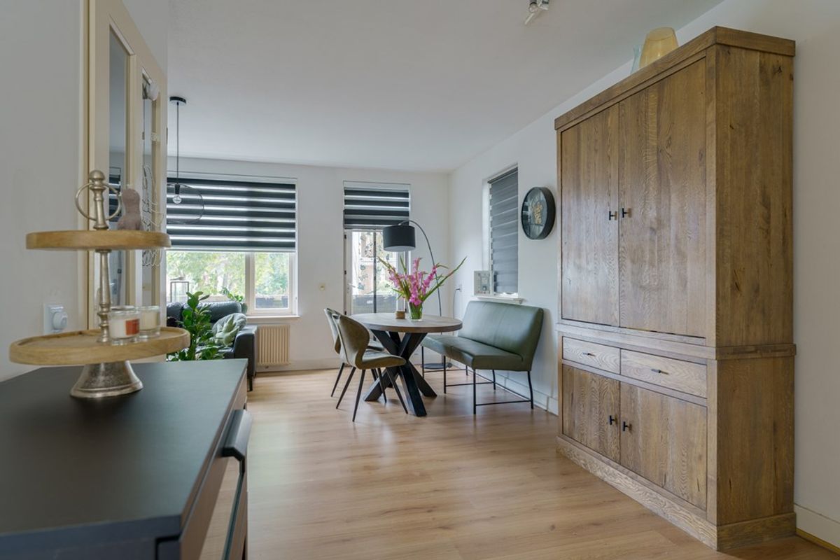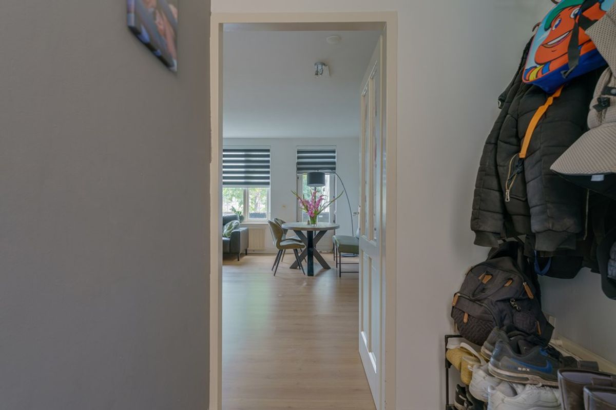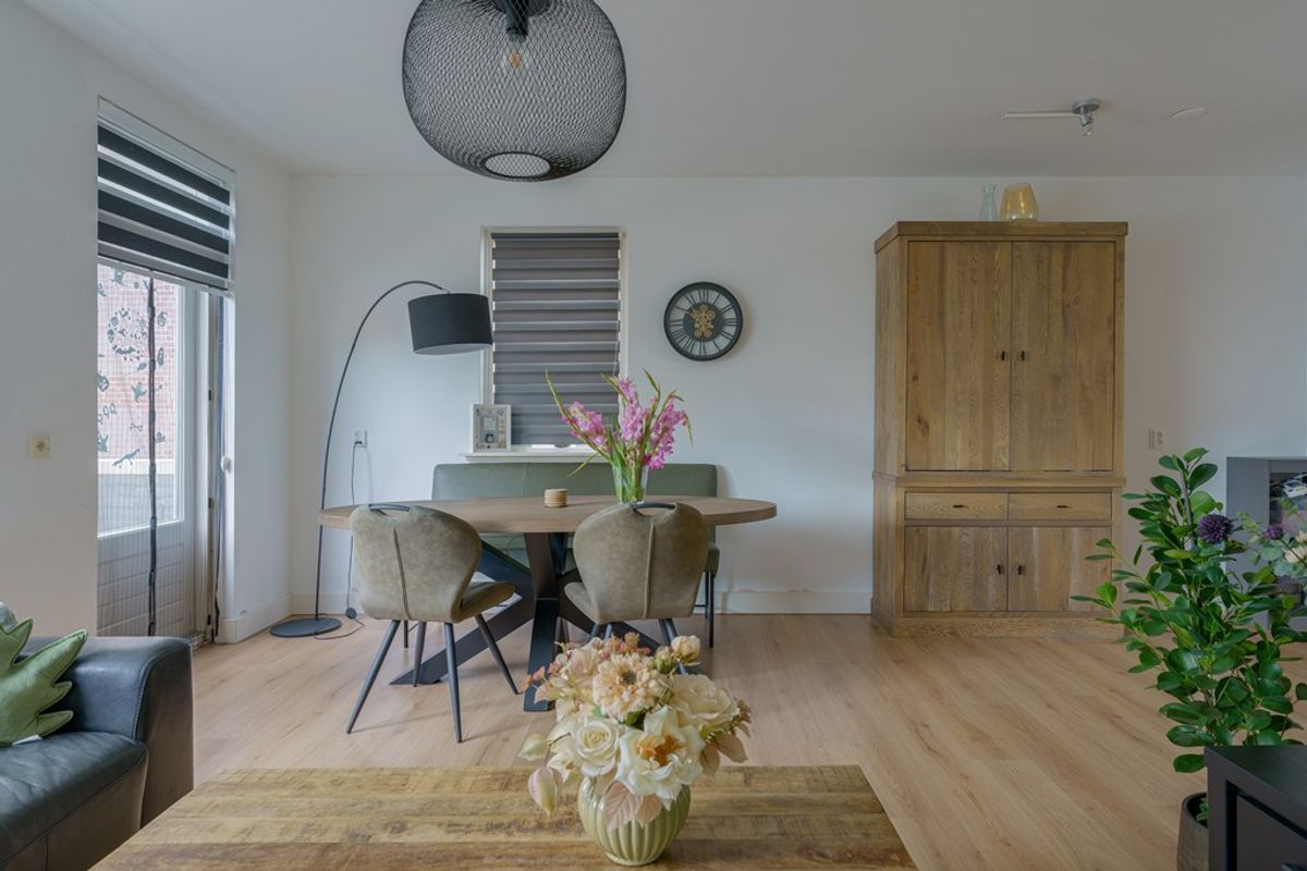 Je komt binnen in een ruime entree met aan de rechterkant de meterkast er is voldoende plek voor een kapstok en schoenen. Loop je rechtdoor, dan stap je de woonkamer in: een lichte ruimte dankzij de grote ramen. Aan de voorzijde van de woonkamer ligt het balkon; aan de achterzijde bevindt zich de keuken, uitgerust met inbouwapparatuur. Vanuit de woonkamer is er toegang tot de hal, links vind je het separate toilet en rechtdoor de trap naar de 1e verdieping.