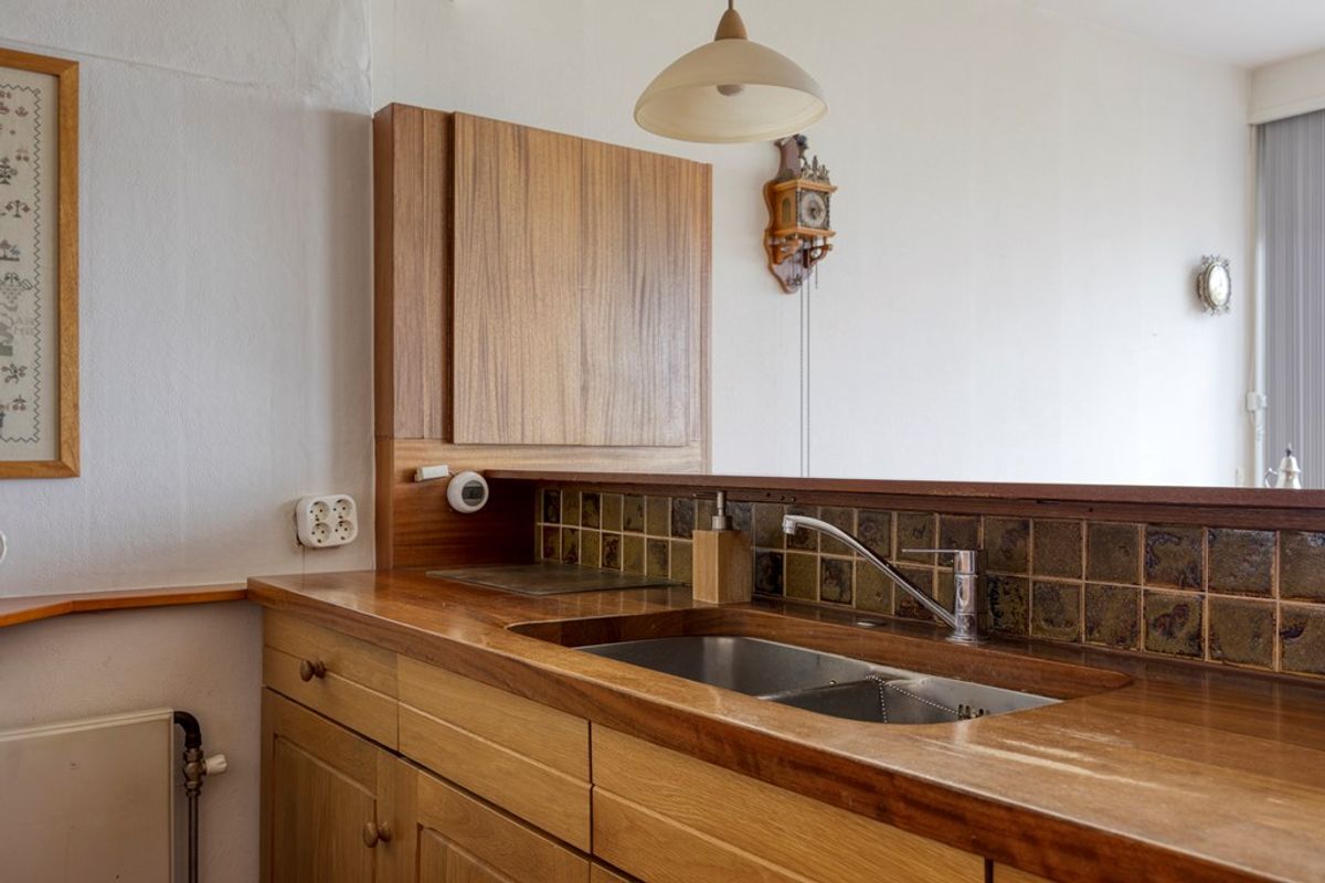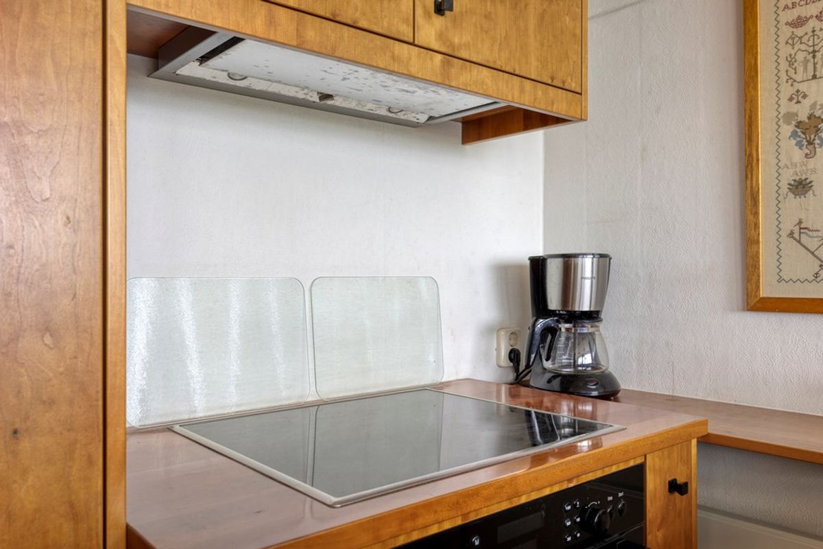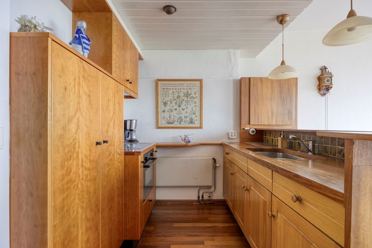 Aansluitend bevindt zich de open keuken, functioneel ingedeeld en voorzien van diverse kastruimte en apparatuur, te weten een inductiekookplaat, vlakschermafzuigkap en oven. De keuken kan indien gewenst gewijzigd worden, er is genoeg ruimte voor een moderne herinrichting.