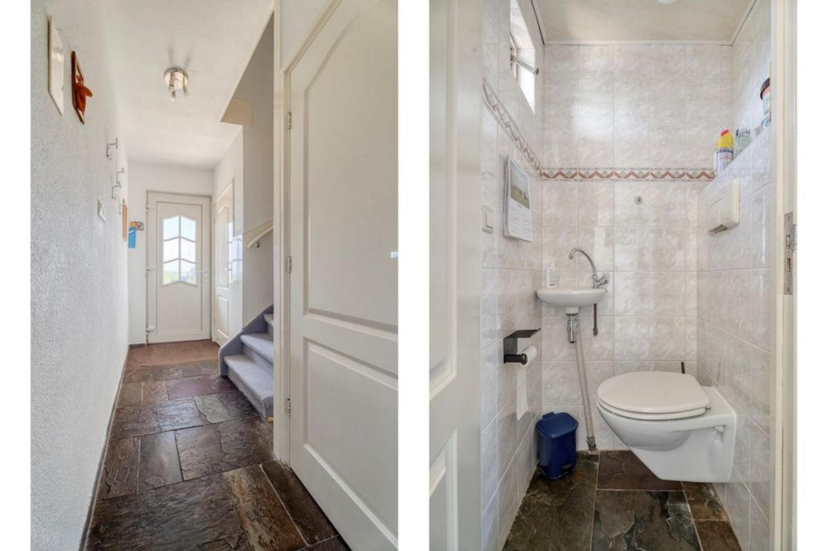 Via de overdekte entree bereik je de hal met meterkast, trapopgang en separate toiletruimte. Vanuit de hal is er toegang tot de ruime woonkamer, die zich aan de voorzijde van de woning bevindt en prettig daglicht ontvangt.